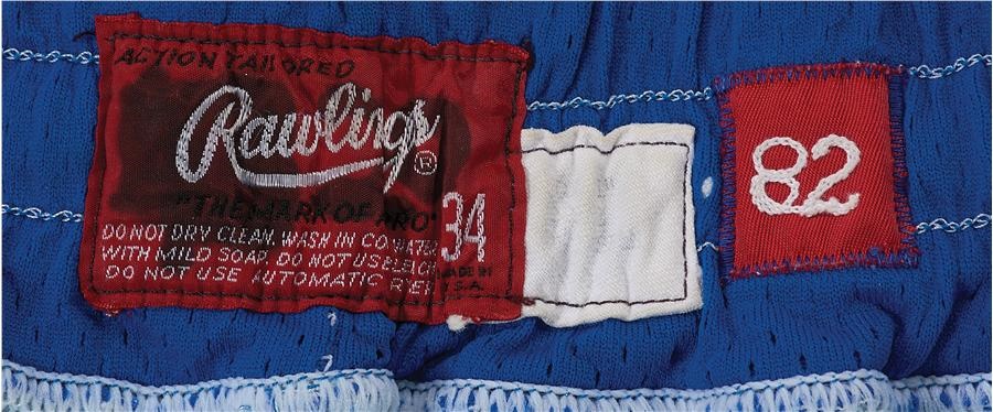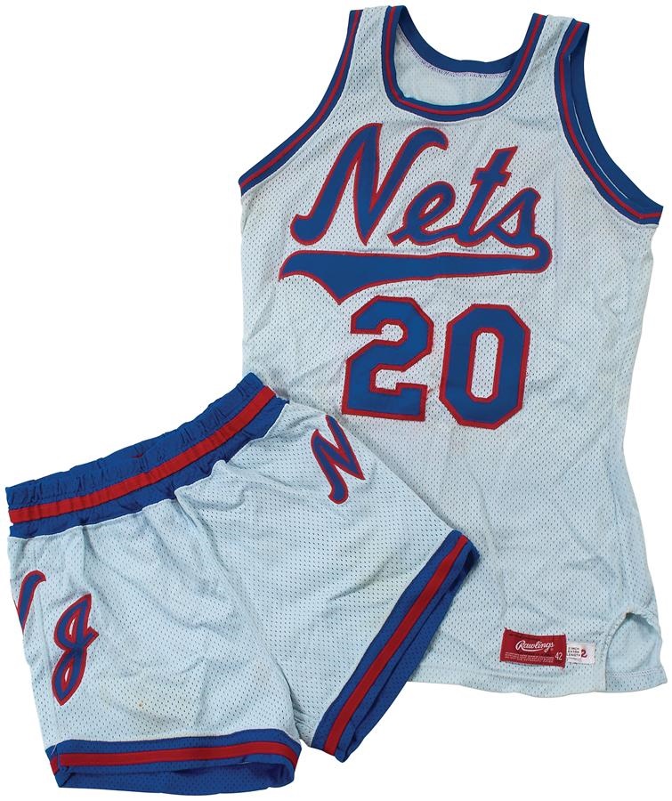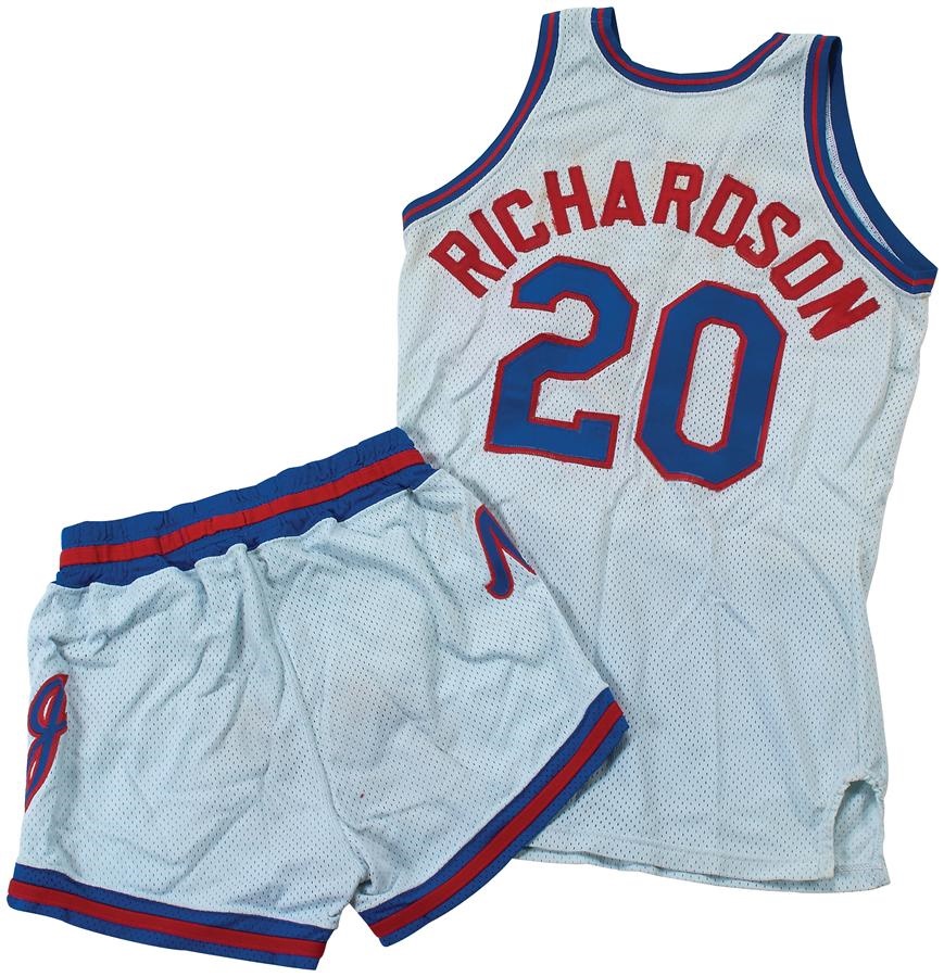 He came to the Nets midway through the 1982-83 season in a trade with the Golden State Warriors and spent the last three-and-a-half years of his career there. From that first season comes this white home jersey and shorts with "Nets 20" on the front and "Richardson 20" on the back. There is Rawlings size 42 with 2-inch extra length tagging on the front tail, as well as an "82" year tag. The shorts feature "NJ" on both thighs and there is a Rawlings size 34 tag in the waist band with "82" year tag. There is marker writing on the Rawlings tag, though it is unreadable. The uniform shows nice game use. "Sugar" averaged 12.7 points and 6.0 assists in his 31 games with the Nets that season.
