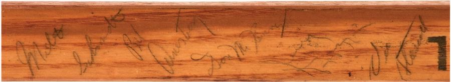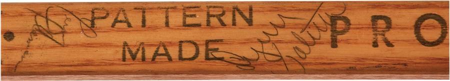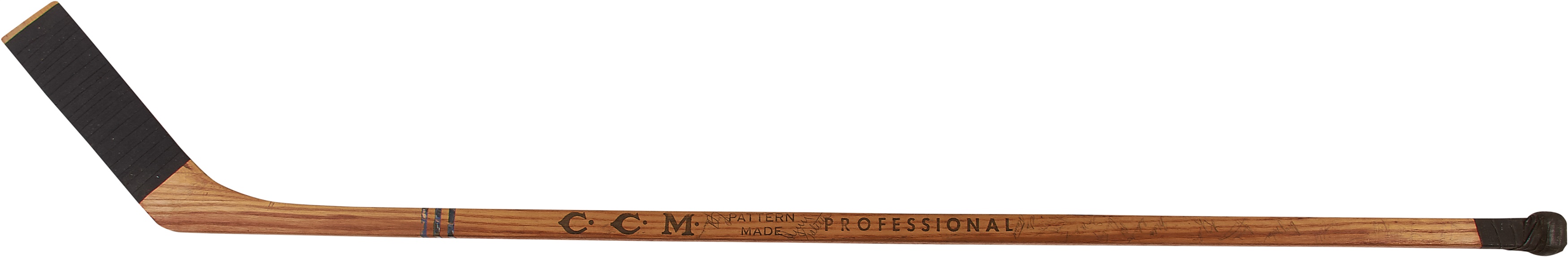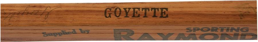 This old-school CCM Montreal Canadiens stick was game-used by Phil Goyette and includes 13 vintage autgraphs. The "Goyette" nameplate is stamped on the straight-bladed stick, which has cloth tape affixed to the blade as well as the shaft, forming a butt-end. It's signed by the Boston Bruins team circa 1958, with autographs including: Armstrong, Flaman, Lynn Patrick, Schmidt, Stasiuk, Bionda, Horvath, Regan, McKenney, Mouhns, Labine, MacKell and Toppazzini. Some of the signatures are somewhat faded, but most are legible.
