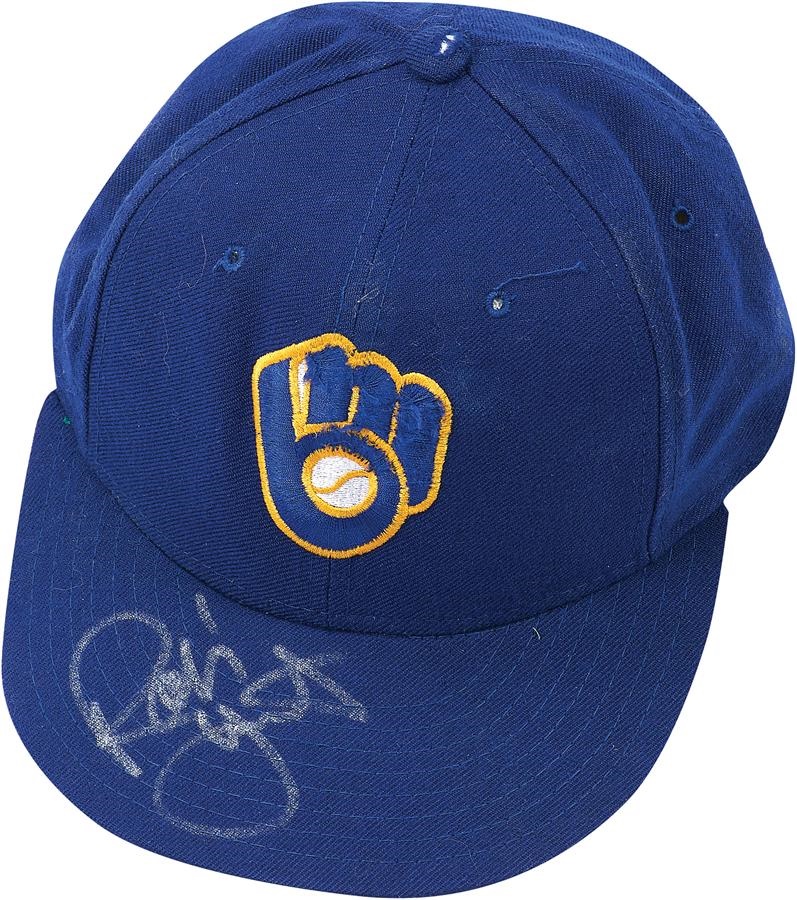 Hall of Fame shortstop Robin Yount donned this vintage Brewers cap at the tail end of his brilliant 20-year career, the entirety of which was played in Milwaukee. Showing signs of moderate use, the New Era size 6 7/8 cap reveals the number "19" written in marker under the brim. The member of the elite 3,000-hit club signed in 6/10 silver Sharpie on top of the brim.