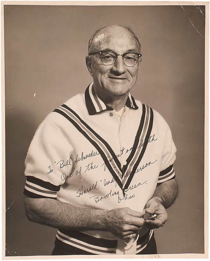 Offered here is a rare Harold Anderson autographed photo; the Hall of Famer was a college men's basketball coach at Bowling Green State University and the University of Toledo in Columbus, Ohio. As a coach he was one of the first to win more than 500 college games, he created and pioneered different styles of play, and developed many All-America athletes, including Nate Thurmond. He died in 1967 at the age of 65. Inscribed to Bill Schroder, of the Helms Hall Museum, and signed Harold "Andy" Anderson, vintage 1960s. He is wearing his college basketball shirt and holding his whistle. The oversized photo, 11x14", has some creasing in the upper right corner but the inscription and autograph are NRMT. From the collection of the esteemed Helms Hall Sports Museum and will come with letter of provenance/authenticity from Lelands.com.