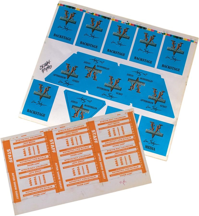This lot features backstage pass original art rare proof sheets for the last performances of Stevie Ray Vaughn before he died in August of 1990; one sheet is from 1989 and the other two are dated March of 1990. The largest is 15x17" and has a satin finish and the other two are 8.75x 11.5"; and the other 8x15" and is with Jeff Beck. All were obtained directly from Otto Printing and Entertainment, who still produces the passes and tickets to this day. Overall EX-MT condition.