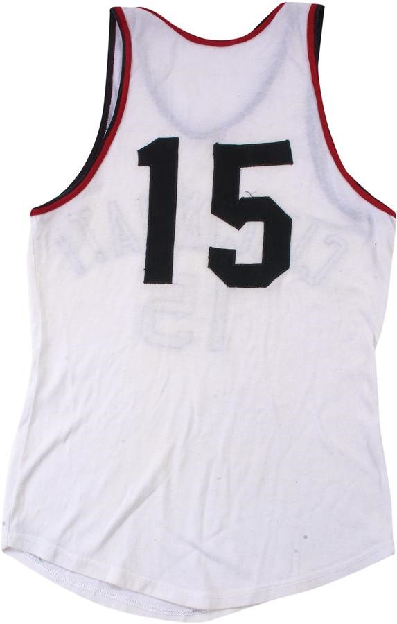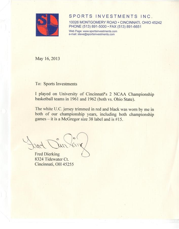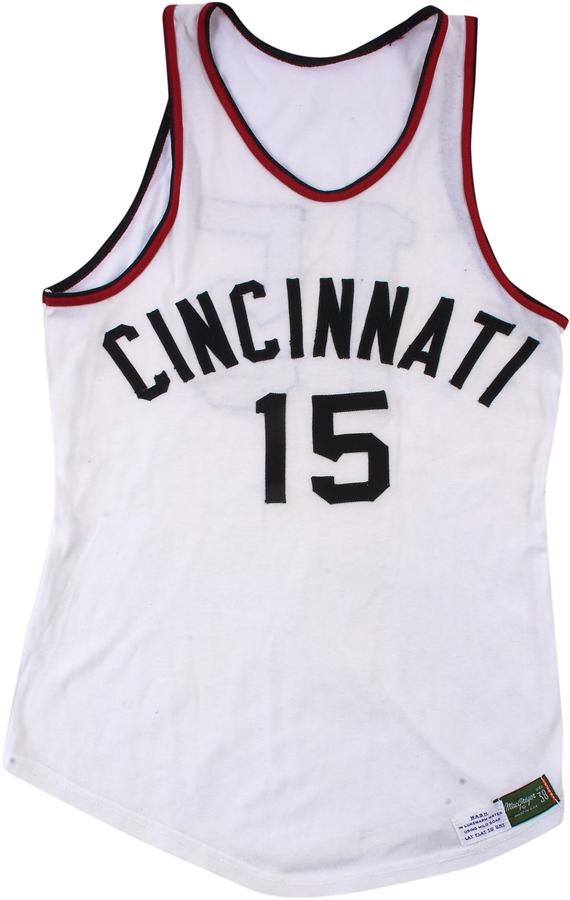 From the back of a Bearcat, this all-original jersey was worn by University of Cincinnati forward Fred Dierking during the team's back-to-back national championship teams of 1960-61 and 1961-62. The white jersey has red and black trim with "CINCINNATI" and "15" on the front while "15" is on the back. There's MacGregor size 38 and washing instructions tagging on the front tail, and it shows great use while still presenting in nice condition. This terrific artifact comes from the collection of Fred Dierking and includes a letter from him in which he states that he wore this jersey in both National Championship games.