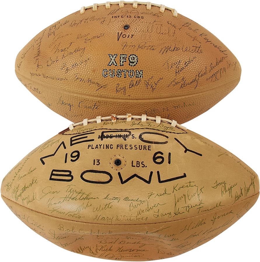 These are two game signed balls, with 80 to 100 autographs on each ball, from the Helms Museum. The first is from 1961 for the first Mercy Bowl and the second ball is for possibly the second Mercy Bowl, also from 1961 which is not referenced in our research. The second Bowl was supposed to be in 1971, when this second ball is from 1961. Additional research is required to determine the source of the second ball. The first Mercy Bowl was played between Fresno State and Bowling Green at the Los Angeles Memorial Coliseum on November 23, 1961, as a special fundraiser in memory of sixteen Cal Poly-San Luis Obispo football players killed in a plane crash following a game against Bowling Green a year earlier. On the first ball, the tag reads "Mercy Bowl Team? 1985.4039 FB.Q476 1961 Fresno St. Underated" and the other tag reads "Mercy Bowl LA State vs. ?" "To raise money form the players of CS Poly S Lo killed in plane crash" 2nd?" The first ball is a "Voit XF9 Custom" and the second Rawlings reads "Mercy 1961 Bowl" The signatures are clearly legible, relatively dark overall, EX to EX+, and the condition of balls is overall EX-MT. From the collection of the esteemed Helms Hall Sports Museum and will come with letter of provenance/authenticity from Lelands.com.
