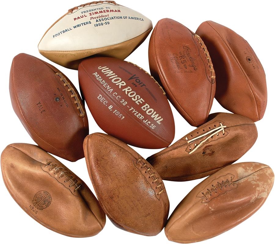 A museum collection of footballs, many are GAME BALLS: 1) 1960s "Yale" University game ball is a Spalding J5-V. Game is unknown but could be important game. 2) 1951 Junior Rose Bowl presentation game ball is painted with the score "Pasadena City College 18, Tyler Junior College 26, Dec 8, 1951" on a Voit ball. 3) Multi-signed ball reads, "Presented to "Paul Zimmerman President Football Writers Association of America 1958-59," with signatures of California sportswriters. 4) 1930s Montana v USC early game ball with museum tag, could be important moment or game. 5) Unknown Spalding J5 game ball. 6-8) Other early balls with autographs we cannot make out, they need further research; as the Museum is located in California, these could be historic games and teams from the West Coast. From the collection of the esteemed Helms Hall Sports Museum and will come with letter of provenance/authenticity from Lelands.com. NOTE: Some or all could have been used in a major event, or from a special donor. Many of the Helms pieces were unidentified with their source information having been lost through the years. However, through photo analysis we were able to prove things previously unidentified by Helms to be very important artifacts. Do your own research and you may have some real treasures here.