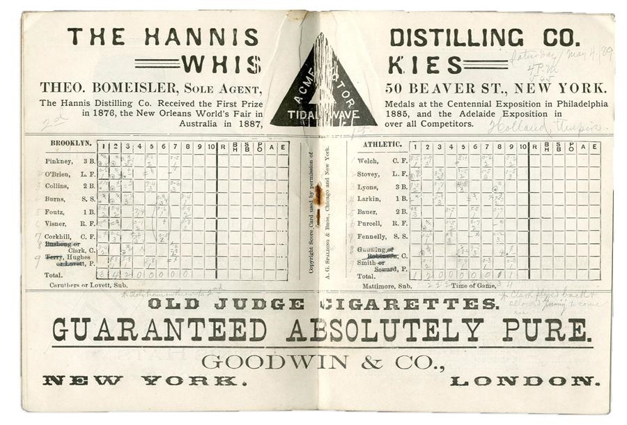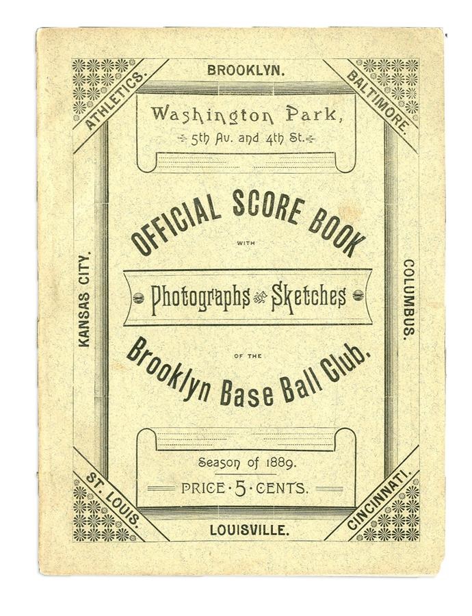 This pristine score book is also a year book, fully illustrated with photographs and sketches of the Brooklyn Base Ball Club. It is a yearbook style publication for an American Association game against the Baltimore Orioles, consists of thirty-two pages of player photos and information. This official score book was expensively executed, with interior pages featuring full-page individual portraits and brief player biographies, along with local advertising. The program contains fifteen individual portrait photos including McGunnigle (manager), Foutz, Terry, Pinkney, Smith, O'Brien. Caruthers, Burns, Collins, Corkhill, and Clark. The interior preprinted scorecard includes O'Brien, Foutz, Pinkney, and Burns for Brooklyn, and Griffin, Shindle, Tucker, and Mack for Baltimore. Neatly scored in pencil, otherwise NRMT condition.