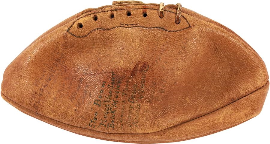 Offered is a California Golden Bears championship game ball with the names of players listed on the ball, some legible and some very difficult to make out. Includes Stew Beam, Muggs Van Sant, Brick Muller and more. The 1920s was first golden age of California football, as the Golden Bears won 50 straight games without a defeat from 1920 to 1925. The 1922 team was so amazing that they were nicknamed "The Wonder Team," and the greatest player from that squad, whose name is included on this ball, is Harold "Brick" Muller. He is extremely important as are some of the other players listed. The Helms Athletic Foundation associated with the Helms Hall Museum, determined this team to be the greatest in football history. The ball is a Spalding Inter Collegiate ball and it is worn from the ages but still a nice specimen. From the collection of the esteemed Helms Hall Sports Museum and will come with letter of provenance/authenticity from Lelands.com. NOTE: Could very well be from a famous event, or from a special donor. Many of the Helms pieces were unidentified with their source information having been lost through the years.