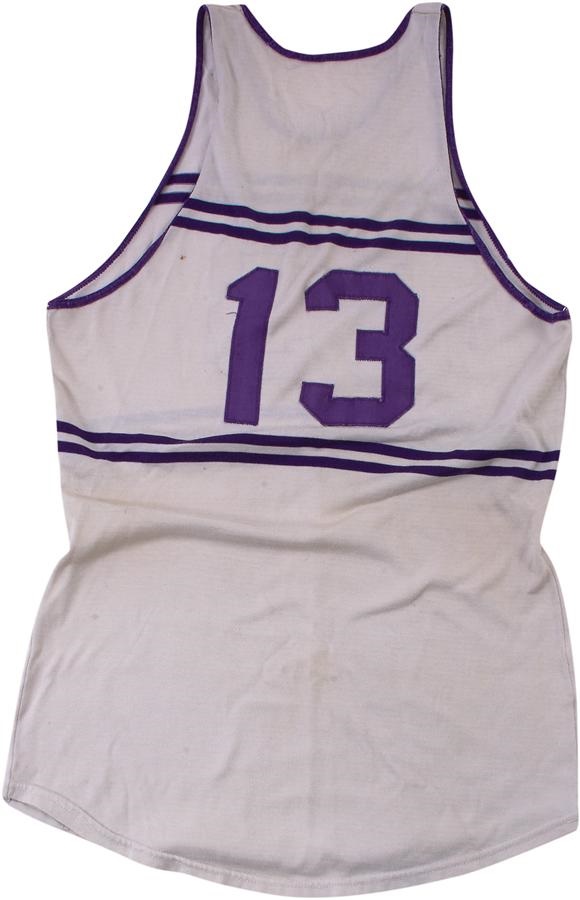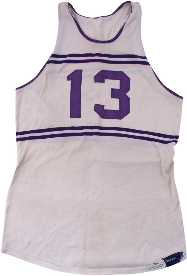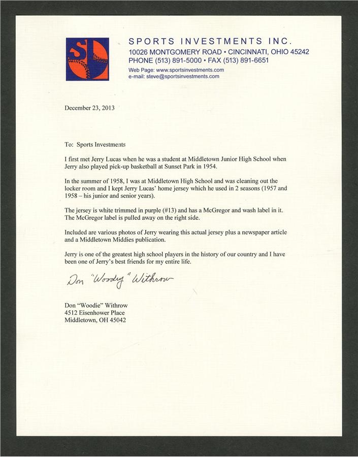 One of the most celebrated high school basketball players ever, Jerry Lucas gained national attention as a 15-year-old playing for Middletown High School in Ohio during the mid-1950s, when the 6'8 budding star made 60% of his shots and dominated the offensive glass. From his seminal days with the Middies comes this rare gem: the only known Lucas high school jersey. It was on Jerry's back during both the 1957 and 1958 seasons, his junior and senior years in high school. The jersey is white with purple trim and features "13" on the front and back. There is a MacGregor size tag along with washing instructions on the front tail, and the jersey exhibits super use while remaining in great condition - a winner all the way, just like the man who wore it! Comes with a detailed LOA from a good friend of Jerry's who received the jersey in the locker room at the conclusion of the 1958 season. The lot also includes multiple photos of Jerry wearing this very jersey. Upon graduation, Lucas went on to star at Ohio State, where he constructed one of the greatest collegiate careers ever, earning Sports Illustrated's 1961 Sportsman of the Year Award. He is still considered to be the greatest Big-10 player of all-time. From then, it was off to the pros, where Lucas played one season for George Steinbrenner's ABL club, the Cleveland Pipers, before switching over to the NBA's Cincinnati Royals, San Francisco Warriors and New York Knicks. This jersey is a genuine treasure from a future Hall of Famer's salad days.