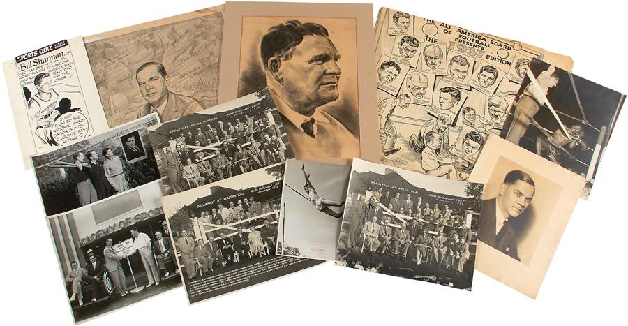 This stunning collection of newspaper original art and vintage photographs was donated to the Helms Museum by Babe Ruth's agent, Christy Walsh. ARTWORK: 1) Christy Walsh was sports director of the 1939 NY World’s Fair. 3-dimensional image of Christy cut-out against a backdrop of the trylon & perisphere logo with thrilling added sports images of the goings on of the Fair. Pen & ink by legendary sports cartoonist Burris Jenkins of the NY Journal-American (18x22"). Inscribed, "All the best to Christy and this is no ghost writing...Burris Jenkins Dec. 16, 1937." Refers to him being a famous ghostwriter for Babe Ruth among others. Has some water damage and a few tears. 2) 1937 All American Board of Football 19x23" pen & ink signed, "To Christy Walsh with Best Regards, Paul Keller." Pictures the great players of that year with King, Matisi, Zarnas, Wojiechowicz, Monsky, Schwartz, Goldberg, Davis, Chapman, Beinor and Frank. Some tears and chipping. 3) Gorgeous matted portrait in charcoal of legendary football coach Pop Warner (17x21"). Inscribed "To Christy Walsh 8-10-32 (signed) Richard Stephens." 4) Pen & ink newspaper cartoon of basketball player Bill Sharman, unsigned but a commercial drawing from a newspaper measures 9.5x14" and EX. PHOTOS (all are Type I, some with Christy Walsh property stamps on versos, primarily 11x14"): 5-12) Gorgeous 1920s portrait of Christy by Apeda, the 1939 Academy of Sport at the 1939 New York World's Fair Pavilion, 1930s with Willkie for President poster, newspaper sports photo, 1940 Diamond Gloves boxing championship and 1955 golfing "Breakfast at Walshateau" journalist meeting (3) and others.