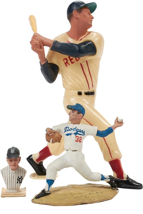 1) Extremely unusual Sandy Koufax sculpture in a composition dated 1967 and signed by the artist. Comes with the original museum tag which reads "Caldwell 6-27-67" and measures 4" high on a 3.5" diameter base. Extremely good quality and a one-of-a-kind art piece. 2) A matching miniature bust of Casey Stengel beautifully executed and measuring a petite 2" high also signed "Caldwell" and dated April 26, 1968. 3) Beautiful condition Ted Williams Hartland statue. Statue is EX+ with the cream color uniform and original bat included. From the collection of the esteemed Helms Hall Sports Museum and will come with letter of provenance/authenticity from Lelands.com.