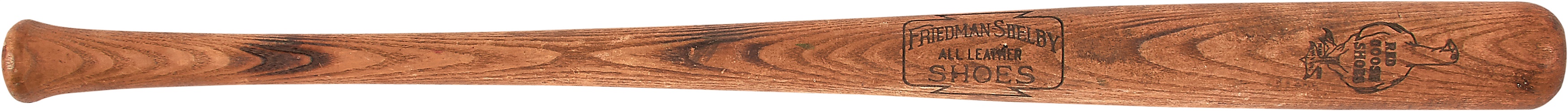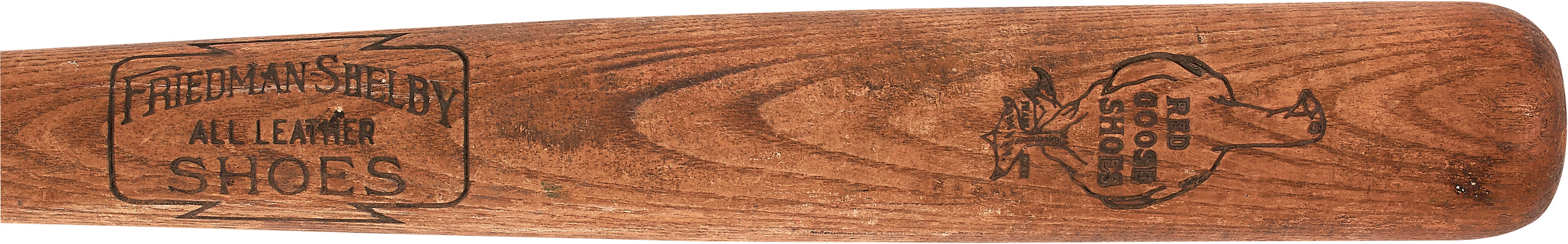 Established in 1869 in St. Louis, the Red Goose Shoes company lasted nearly a century before merging with the International Shoe Company, which later bought Florsheim. During Red Goose's latter years, they produced this 33 inch bat with the center brand being: "Friedman Shelby All Leather Shoes," while the barrel features a goose illustration with "Red Goose Shoes" branding. The wood is a bit dry but uncracked.