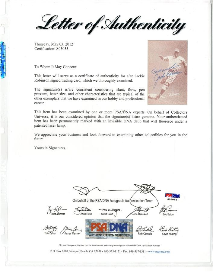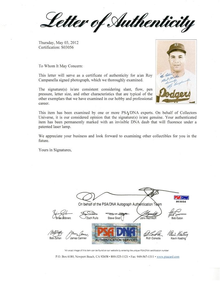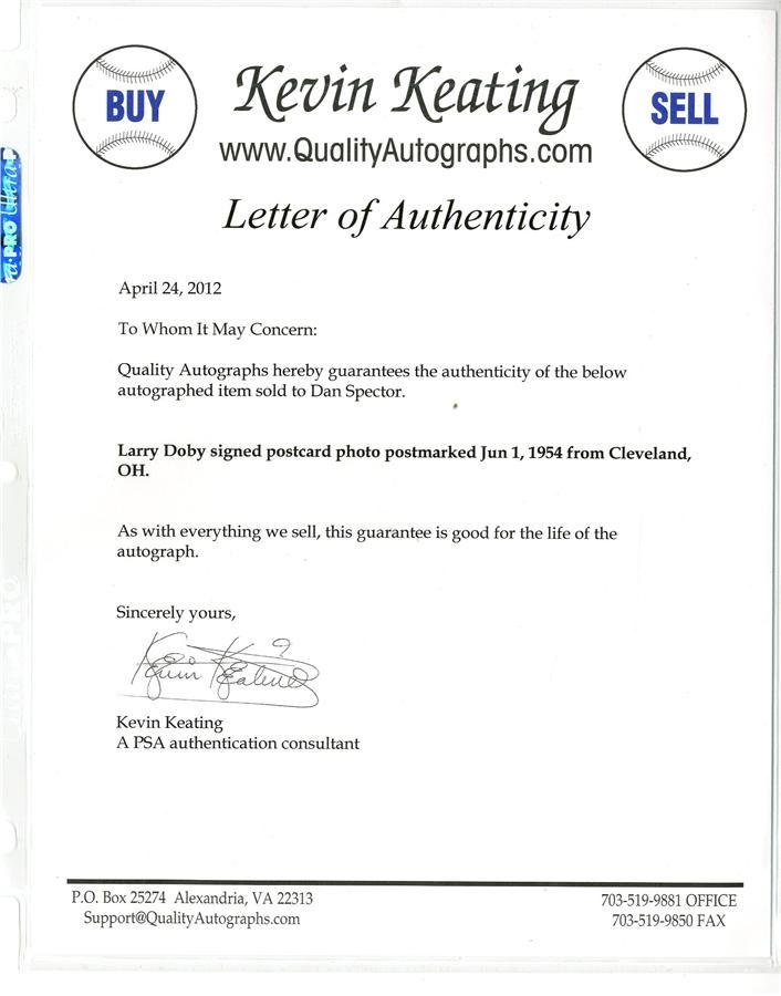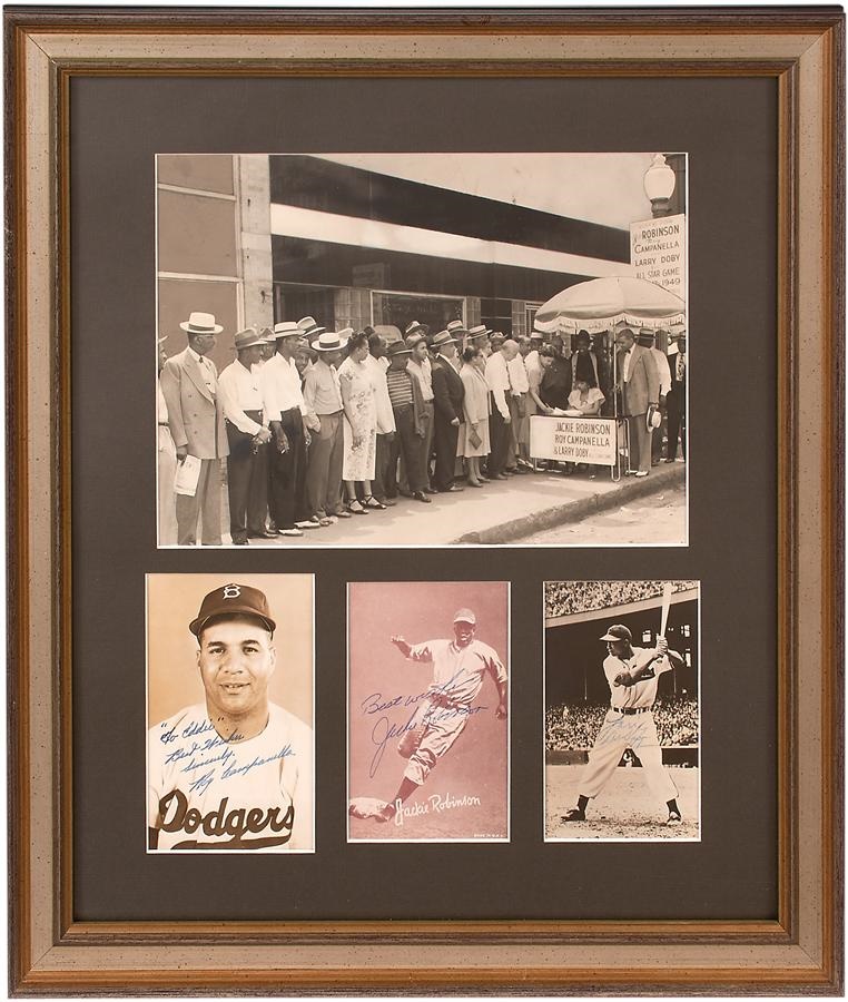 Years before they won their first title, the Brooklyn Dodgers were unquestioned champions when it came to the civil rights movement, breaking baseball's color barrier with the Jackie Robinson signing as well as the addition of catcher Roy Campanella the following year. The Cleveland Indians, following the Dodgers' lead, made Larry Doby the American League's first black player three months after Jackie's debut, and all three men are commemorated in this framed and matted display that measures roughly 17x19.5". The photo at the top is an original shot of fans lined up to see the 1949 All-Stars with Jackie, Campy and Doby on hand. Beneath are a small Campanella photo that is signed and personalized in 9/10 blue ink, as well as a Jackie Robinson 1950s exhibit card signed in 8/10 blue pen and Larry Doby postcard signed in 7/10 blue ink. The display appears EX and comes with PSA LOAS on the Campy and Jackie items.
