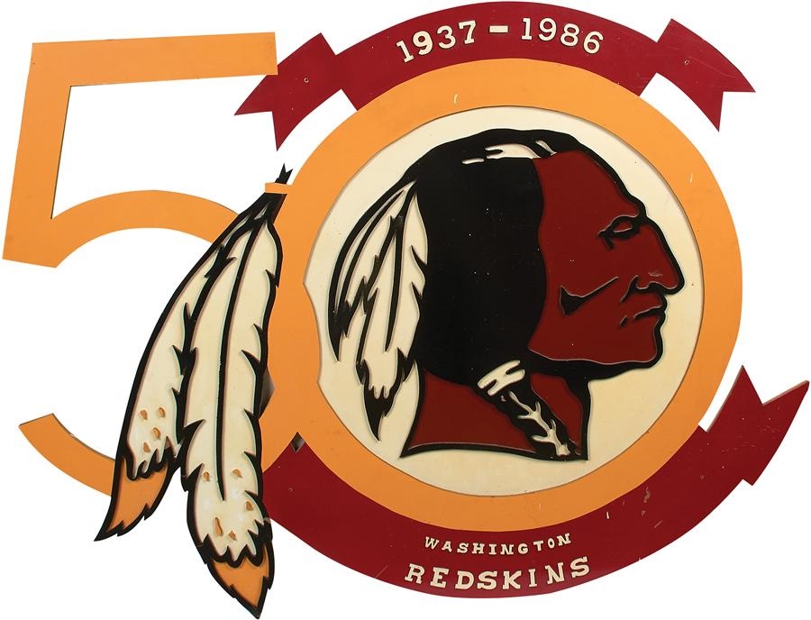 Even though politically incorrect, the supporters of this team, conspicuously located in our nation's capital, refuse to change the name and logo. It symbolizes a bygone era and a giant in sport's history, defining both football and popular culture. This sign is large enough that the viewer can't help but have an emotive reaction, but is not too large as many of these displays designed for stadiums often are. It measures 49x55" approximately, and is made from double layer pressed wood. It contains hand-painted, commercially-created stadium art, with a figural image of the Indian symbol which was interestingly, approved by the Native American leaders circa 1971. This amazing figural display was in the stadium for just one year, thus, it was able to stand the test of time. The imagery of the logo has dimension, it is raised in three colors red, orange and white. A few of the letters have been replaced, otherwise 100% original and the overall condition of the sign is EX-MT.