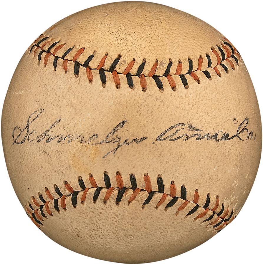 Charles Schmelzer sold guns and sporting goods in the Kansas City market roughly a century ago, and here's an example of the latter: a baseball with label on sweet spot the reads: "Official League Ball, Cork & Rubber Centre." On the panel above is the Schmelzer's Sporting Goods, Kansas City logo, while on the opposite sweet spot is stamped "Schmelzer Arms Co." in script. The ball is in VG-EX condition.
