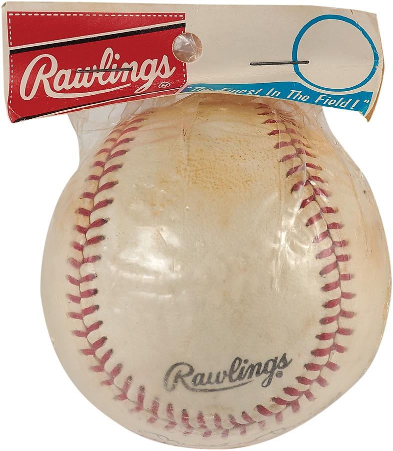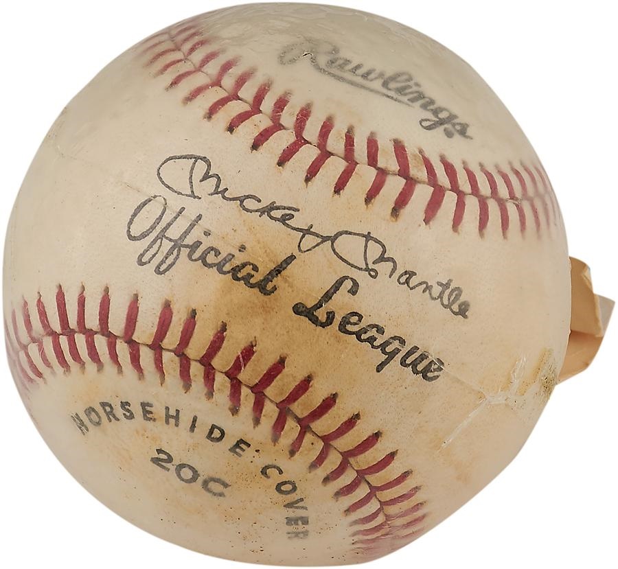 From the last decade of "The Mick's" career, this Rawlings baseball with the Hall of Famer's facsimile signature on the sweet spot is sealed in the original plastic with Rawlings cardboard (with hanging hole) at the top. The ball is in EX condition with slight toning.