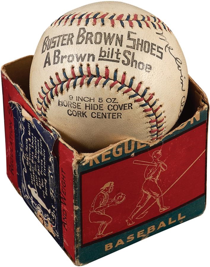 Back in 1904, the Brown shoe company and popular Buster Brown comic strip joined forces at the World's Fair and the two entities remained in business together for decades. Here's one of the fruits of their labors: an unused baseball with "BUSTER BROWN SHOES, A BROWN BILT SHOE" stamped on the sweet spot with "Melvin Ott" facsimile signature on a side panel. The ball features red and black stitching and is in EX-MT condition. The original box is missing its top flap but otherwise is VG.