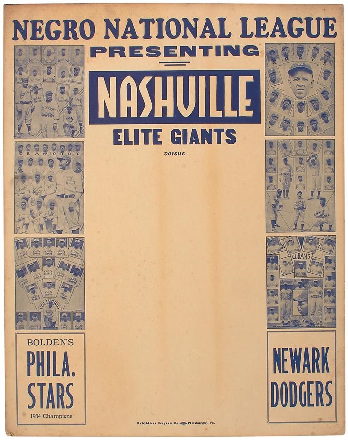 While American League MVP Hank Greenberg was powering the Detroit Tigers to the 1935 World Series title, some of baseball's best players were toiling in the Negro Leagues. That very same summer produced this Negro National League broadside poster trumpeting the Philadelphia Stars vs. the Newark Dodgers and reads: "Negro National League Presenting Nashville Elite Giants Versus (blank)." Measuring 22x28", the Exhibitors Program Co., Pittsburgh, PA poster has some minor yellowing and a crease under "Elite Giants" that runs from the left side of the poster to right but the overall condition is VG-EX.