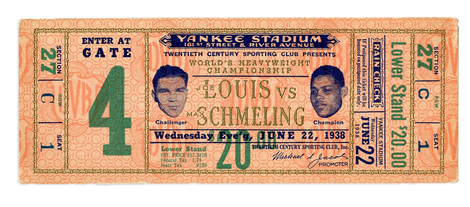 Joe Louis fought Max Schmeling for the second time on June 22, 1938, at Yankee Stadium. Louis had been stopped by Schmeling in their first fight in 1936, marking the first time Louis had felt the sting of defeat. In this celebrated second fight, Louis knocked Schmeling out in the first round to retain the World Heavyweight Title. This was one of the most historic fights in boxing history, fought against the backdrop of the rise of Hitler and Nazi Germany and the looming second World War. Offered here is an original full, unused ticket for this fight, picturing both fighters and it has raised lettering. Tiny crease in lower left corner but not torn, with minor edge, surface and corner wear. It measures 2.5x5.5", a fine example.