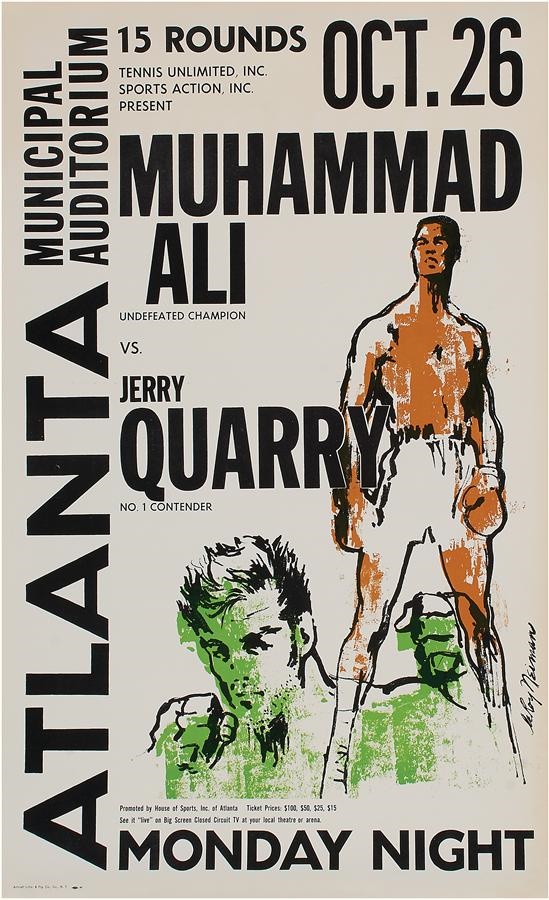 On October 26, 1970, at City Auditorium in Atlanta, Georgia heavyweight Muhammad Ali made his comeback after a three year enforced retirement due to his refusal to accept military service. His opponent was the capable Jerry Quarry. Ali scored a third round victory when the referee stopped the fight due to a severe cut on Quarry's face. Offered is an original, on site poster for this event. This paper poster features LeRoy Neiman depictions of the fighters, with bold color and print. Not creased or torn and with no tack holes, there is slight toning of the paper from aging and very minor corner wear. One of the nicest examples of this scarce poster we have offered and it is original, not a repro, measuring 14x 22."