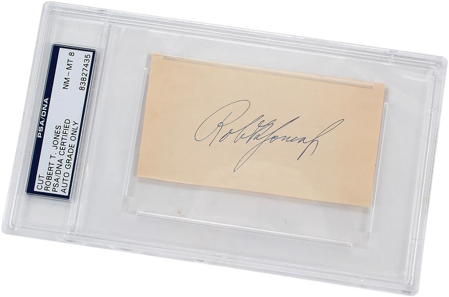 He helped design the Augusta National Golf Club and co-found the Masters Golf Tournament. Bobby Jones holds the distinction of being the most successful amateur golfer in the world, and this cut signature is an early example from the lawyer's days on the links. It is signed "Robert T. Jones Jr." in 8/10 blue ink (his middle name was Tyre) and the signature on off-white paper has been encapsulated by PSA and graded NM-MT 8.