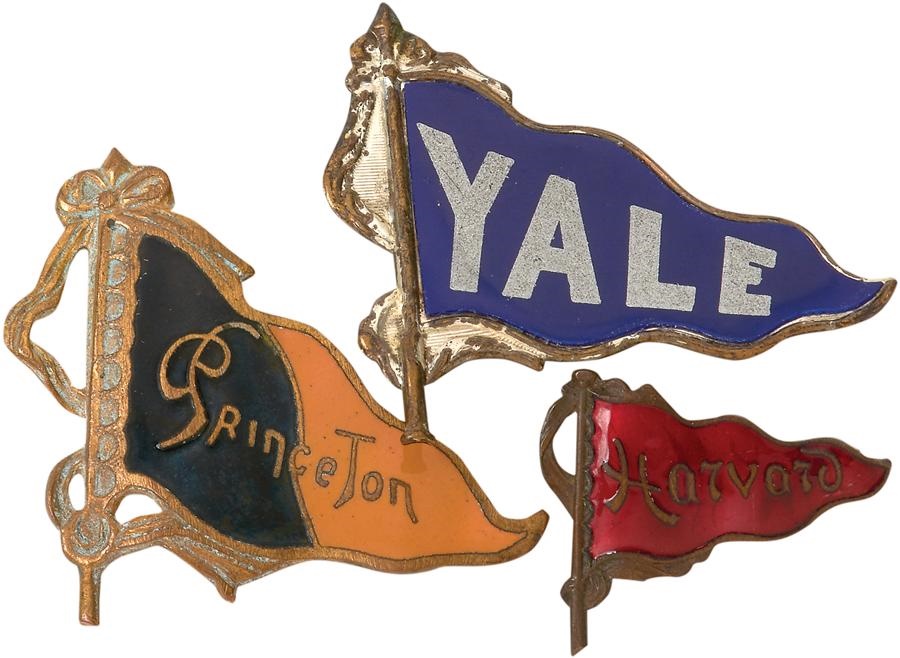 All hail the Ancient Eight! From over a century ago, these three pins from Ivy League schools Yale, Princeton, and Harvard are in the shapes of pennants and feature color enamel on the fronts and pins on the back. The Harvard Crimson flag is slightly smaller than the other two, and their overall condition is EX.