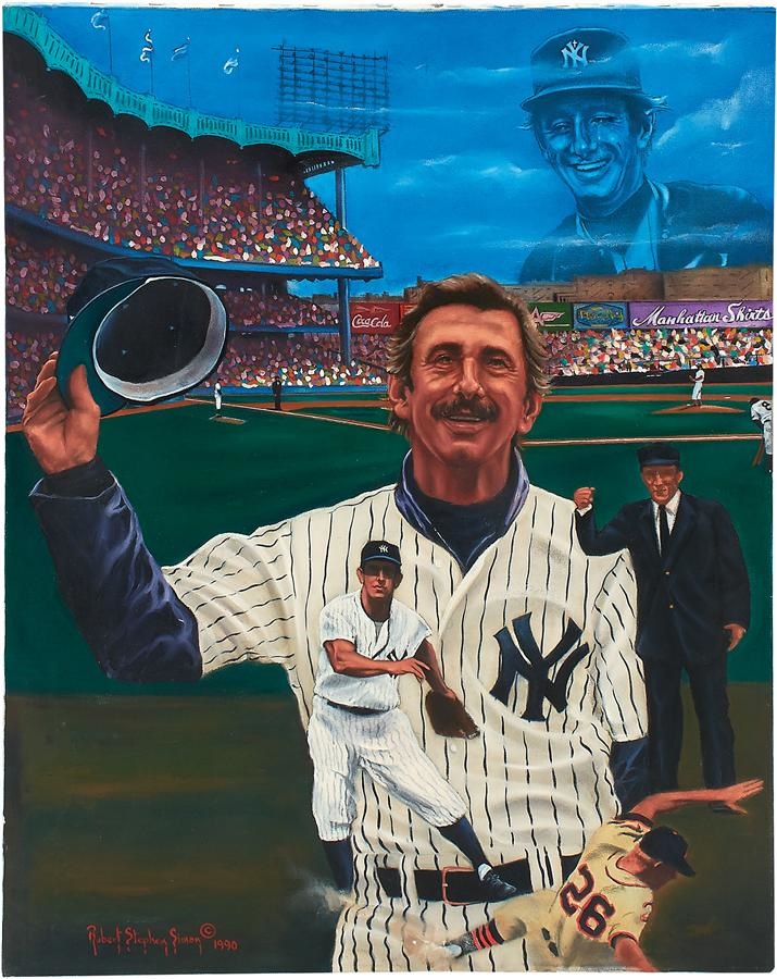 One of the most respected and misunderstood figures in professional sports history, Billy Martin played for and managed (and managed, and managed, and managed, and managed...) the Yankees. This original oil painting on canvas commemorates the former second baseman and successful skipper as he doffs his cap to a cheering Yankee Stadium crowd, with his ghostly image also appearing in the sky. The piece measures 24x30" and is signed "Robert Stephen Simon 1990" on the bottom left.