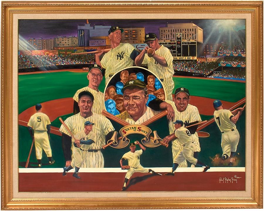 Stately and striking, this original oil painting on canvas from esteemed artist Robert Stephen Simon features his signature use of chiaroscuro lighting and memorializes the most celebrated American sports figure ever - Babe Ruth. Measuring 36x48" and 43x55" in its frame, the "Sultan of Swat" is centered while being surrounded by fellow Yankee legends including Lou Gehrig, Mickey Mantle, Joe DiMaggio, Yogi Berra and Whitey Ford. It is signed "Robert Stephen Simon 1990" on the bottom right and includes a gold plaque on the bottom with the engraving: "Sultan of Swat by Robert Stephen Simon."