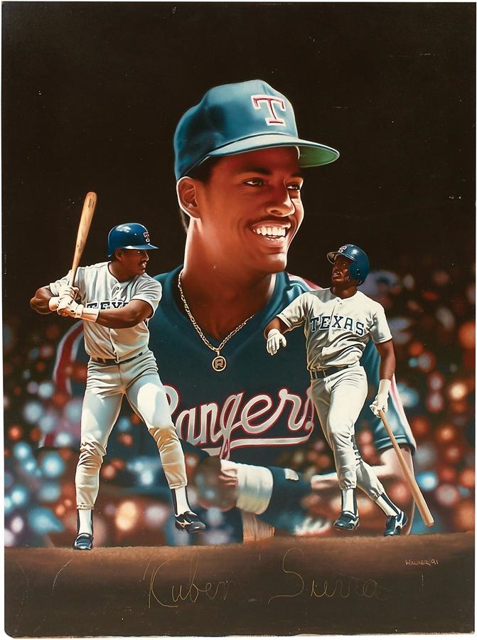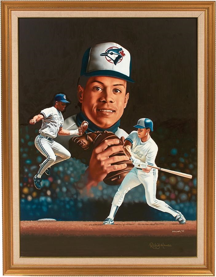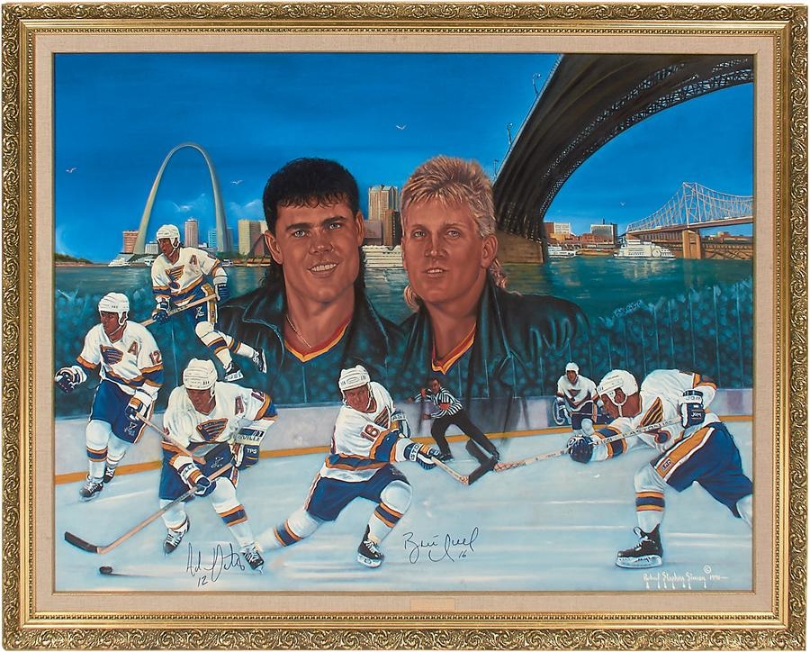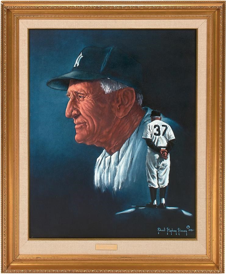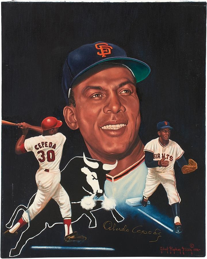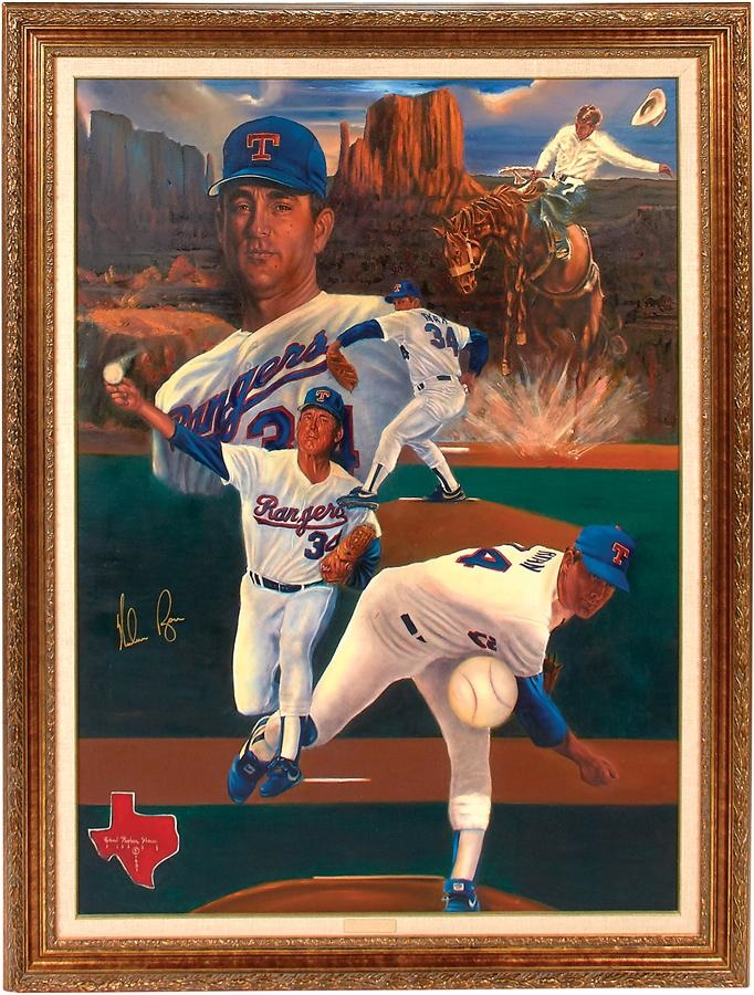 Half a dozen sports stars are spotlighted in this set of five original oil paintings. Here's the lineup: Orlando Cepeda on canvas with a bull depicted, representing his nickname, "The Baby Bull." The 24x30" artwork was signed by Cepeda in gold, as well as "Robert Stephen Simon 1991" on the bottom right. Also an original oil painting on board signed by Cepeda in gold at the bottom and "Walker 91" on the bottom right, measuring 30x40", Casey Stengel original oil painting on canvas measuring 24x30" and 32x38" in its frame and signed "Robert Stephen Simon 1991" on the bottom right. There's also an old plaque on the bottom with the engraving: "The Ole Professor by Robert Stephen Simon," a Roberto Alomar original oil painting on board signed by the star second baseman in gold on the bottom right, as well as by "Walker 91" on bottom right. It measures 30x40" and 36x45" in its frame. Then there's "Hull & Oates," a 36x48" (43x55" framed) painting on canvas signed by Brett Hull and Adam Oates in blue, as well as by "Robert Stephen Simon 1991" on the bottom right. The piece includes a gold plaque on the bottom with the engraving "Hull & Oates by Robert Stephen Simon." Lastly, a painting on canvas of Nolan Ryan, signed by the Hall of Fame pitcher in gold, as well as by "Robert Stephen Simon 1991" in the same corner, alongside a gold plaque with the engraving "Texas Homecoming by Robert Stephen Simon." The artwork measures 36x48" and 44x56" in its frame.