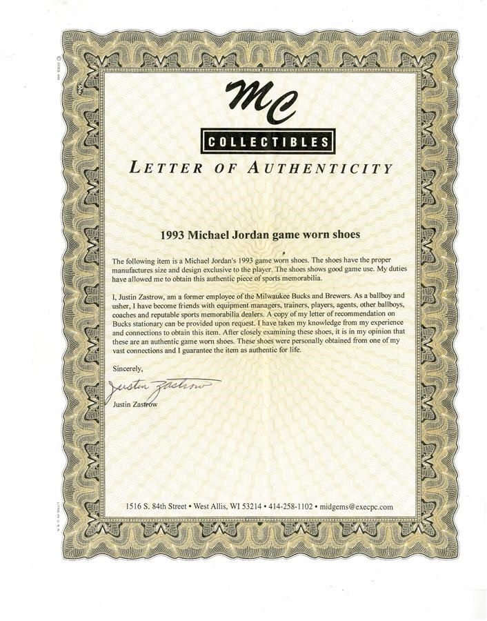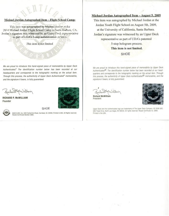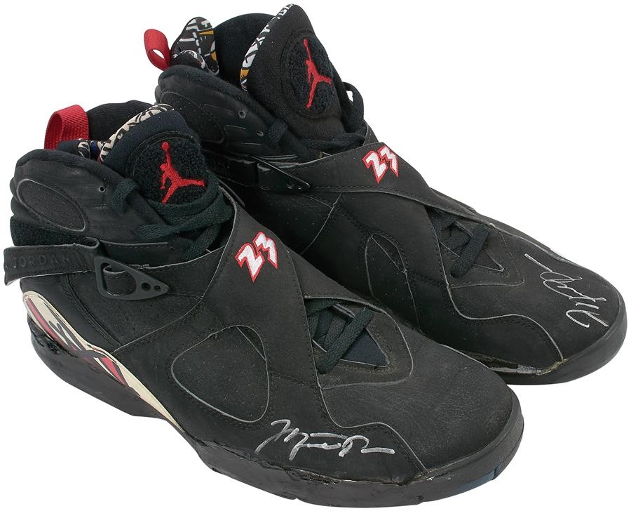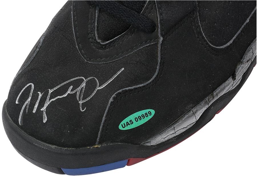 Among his many stunning career accomplishments, Michael Jordan was named MVP of the 1993 NBA Finals, dropping an amazing 41 points per game. These black size 13 sneakers are of an exclusive style only made for and used in the 1993 postseason. Both are signed in silver and come with COAs from Upper Deck (hologram on the right shoe is under the black restoration because these shoes are notorious for splitting at the heel). These are sourced from a Bucks employee and come with a signed LOA by the employee and the Bucks equipment manager. They show nice use and each includes MJ's number 23 embroidered on the strap, with the iconic "Air Jordan" logo embroidered in red on the tongue.