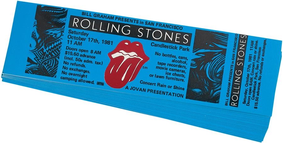These are actual unused tickets for the October 17, 1981, Rolling Stones concert at Candlestick Park, San Francisco. Featuring wonderful graphics, these are real tickets showing both fronts and backs. In NRMT condition, obtained directly from Otto Printing and Entertainment, the dominant manufacturer of backstage passes and tickets for the music industry to this day.