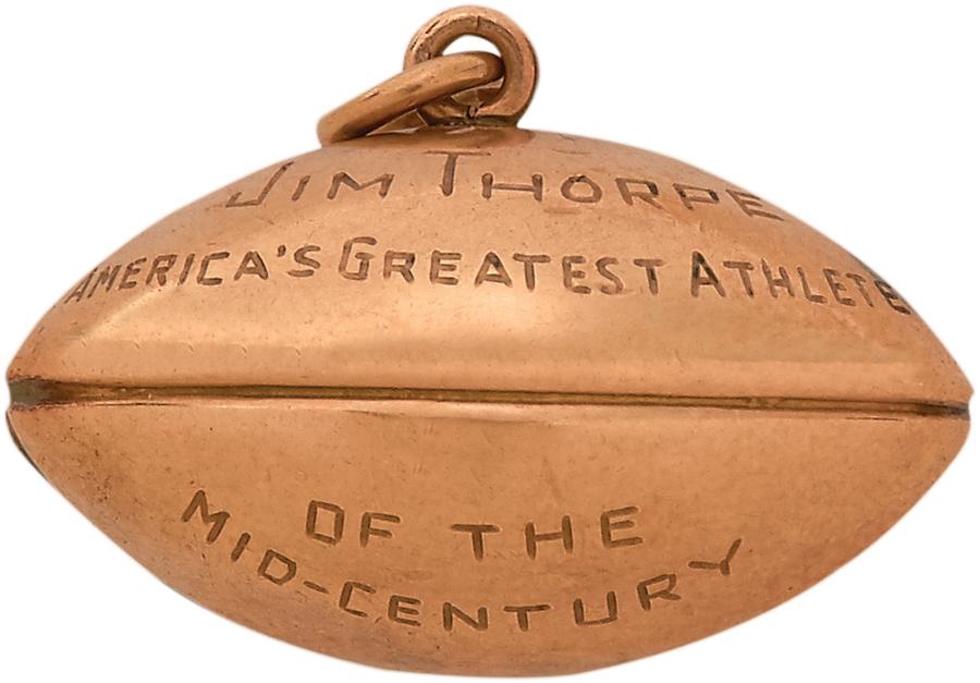 Lot # 1074: 1950 Athlete of the Half Century Gold Football Pendant Presented to Jim Thorpe