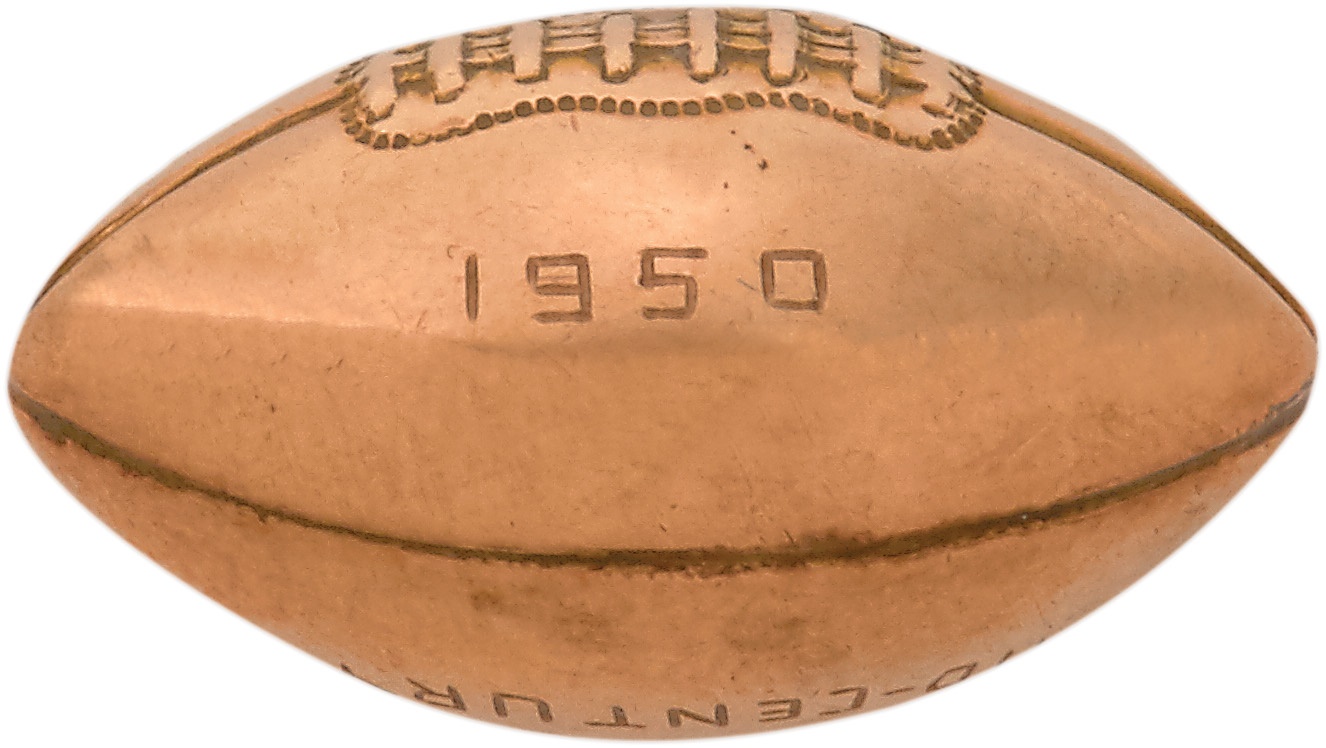 The greatest athlete who ever lived was the recipient of this one-of-a-kind tribute from the Philadelphia Inquirer newspaper some 66 years ago. This was a key award given at the same time as the Associated Press Award given to Thorpe for nearly the exact same title: "Greatest Athlete of the Half Century." Interesting that the Inquirer was competing with its AP publishing brethren for their local son. 14K gold football is engraved: "Philadelphia Inquirer 1950, Jim Thorpe, America's Greatest Athlete of the Mid-Century." Important award is in the shape of a football complete with laces. It is in EX-MT condition. It is understandable that an award as important as this one would get out from Thorpe and his family as he suffered from alcoholism, poverty and poor health in his final years, dying in 1953 just three years after its presentation.
