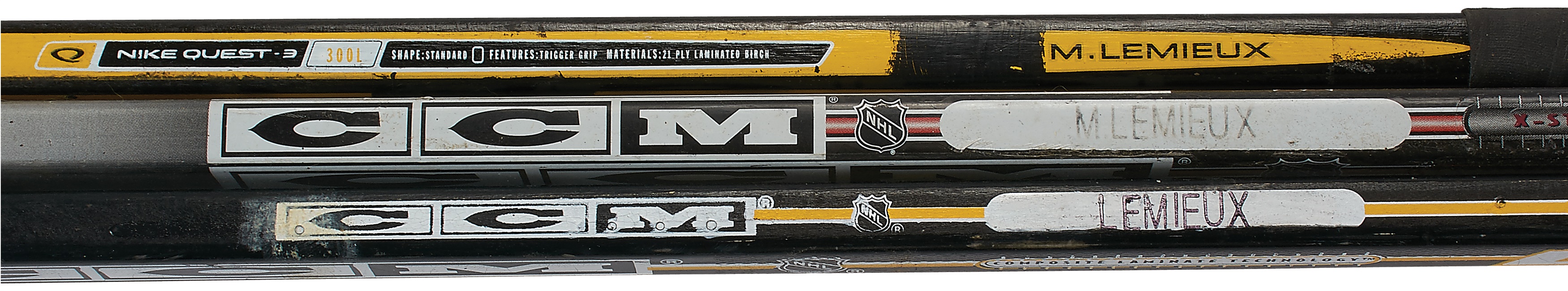 Here is a great lot of three hockey sticks, game used by one of the greatest to ever lace skates. All of these are from later in the career of Mario Lemieux, with each showing light to moderate use. Included are; a black and yellow Nike stick with Nike logos painted over and "M. LEMIEUX" on the shaft. Gripper on the butt end and tape removed from blade; a CCM Vector with "LEMIEUX" on the shaft, gripper on butt end and tape removed from the blade; CCM Vector V130 is circa 2005, has gripper on the butt end, tape removed from blade and "M. LEMIEUX" on the shaft. Despite his physical ailments, "Super Mario" is still on the very short list of top NHL players ever.