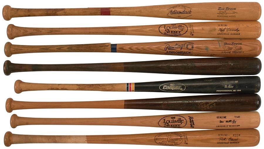 Lot includes the following game used bats, all sizes are approximate: 1977-79 Jack Clark cracked (34.5"), 1986-89 Joe Charboneau signed "80 R.O.Y." light use, (34") uncracked, 1977-79 Rod Carew not used by Carew but by another player (34.5") cracked, 1984-85 Keith Hernandez batting practice used by someone else (34") cracked, 1980s Tim Raines (33") cracked, 1970s Ted Simmons (34.5") cracked, and 1986-69 Don Mattingly shows no use (33.5") uncracked. The last bat is a store model Carlton Fiske uncracked.