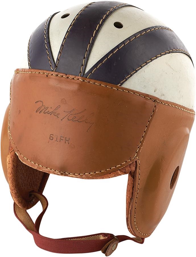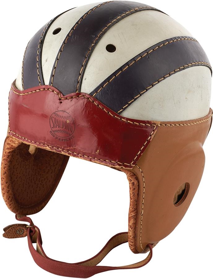 Believe it or not, this is a football helmet of the 1940s era, and this one is a beaut. In EX condition with original chin strap, this Spalding lid looks like it was barely ever used. Comprised of great colored leather in red, light brown, dark brown and white, it features the Spalding logo on the front and "Mike Kelly" on the back with model number 61FH.
