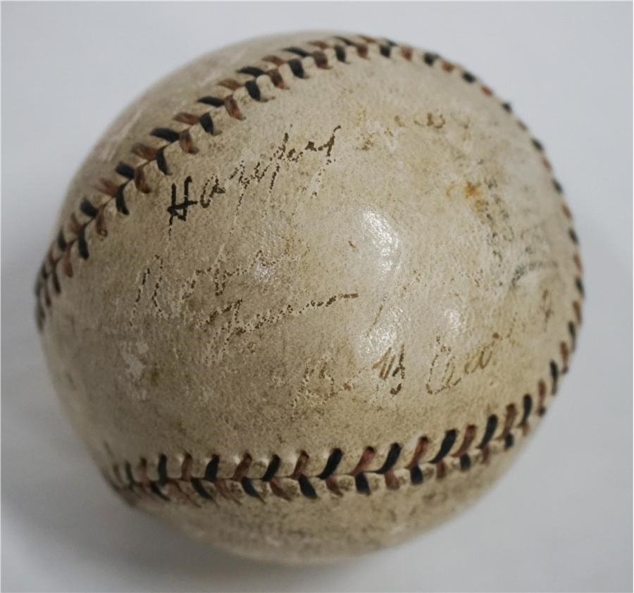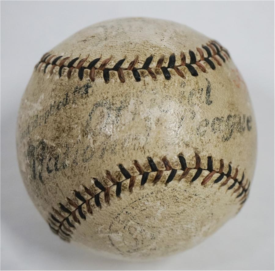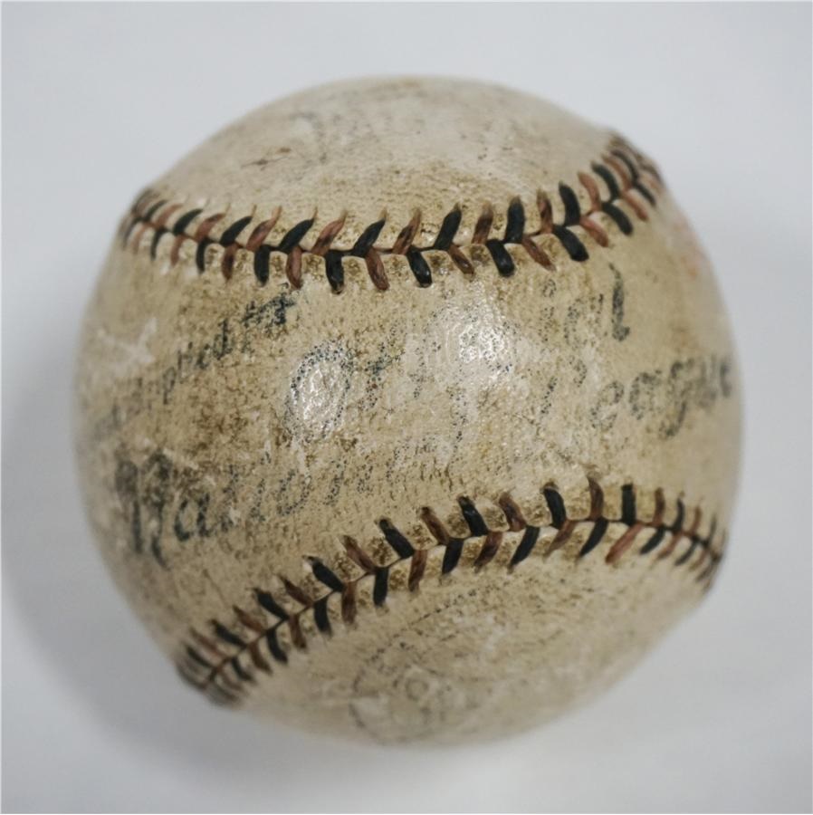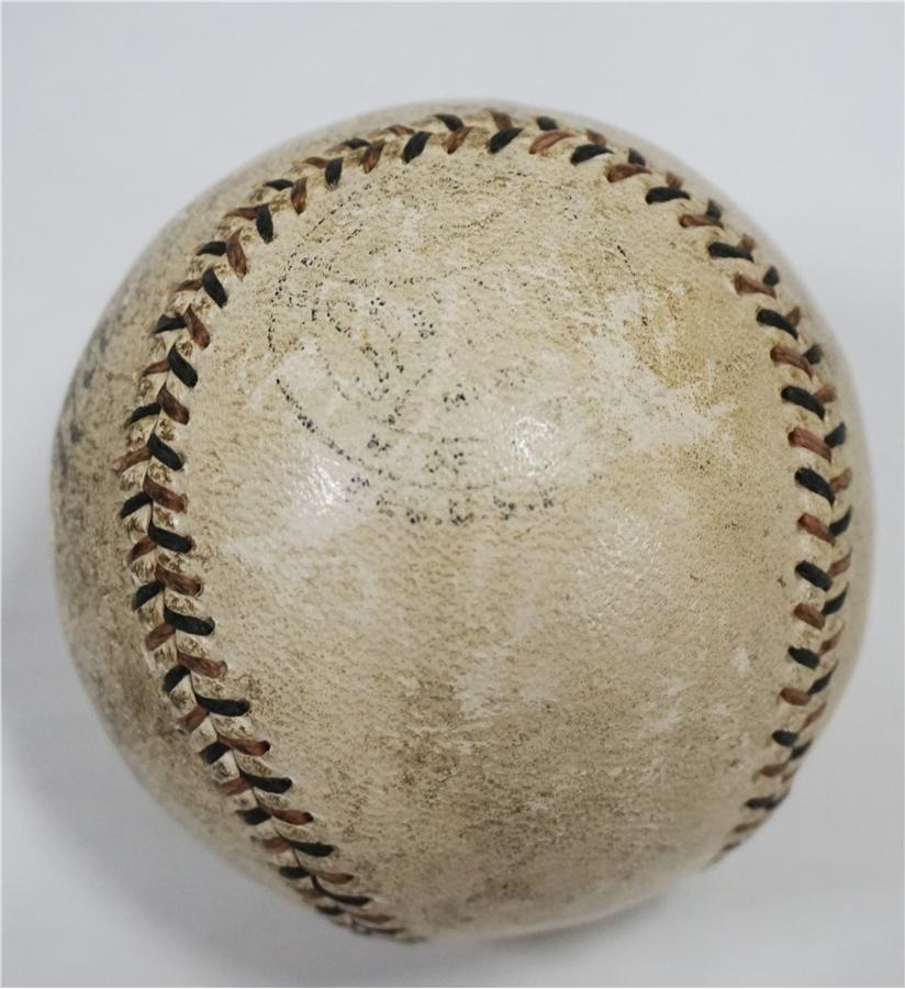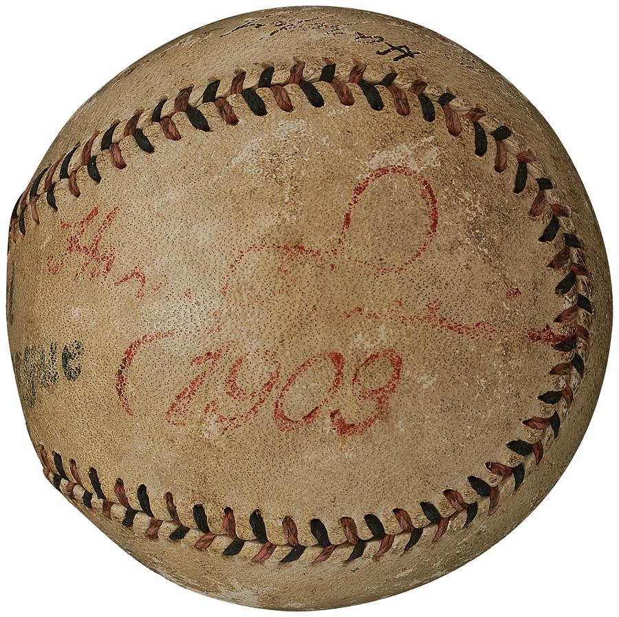 One of the toughest baseballs to find, this 1909 model appears game used with readable (but faded) stampings. While it appears that there are a few signatures are on it, we cannot read them, though one appears to have a last name of "Ewing." Bearing the alternating black and red stitching of the era, the Official National League stamp resides on the sweet spot with the Spalding logo on panel below and in red on a side panel is the "Harry Pulliam" facsimile signature with the year of "1909." It does show its age, but after a century since its production, it remains in great shape.