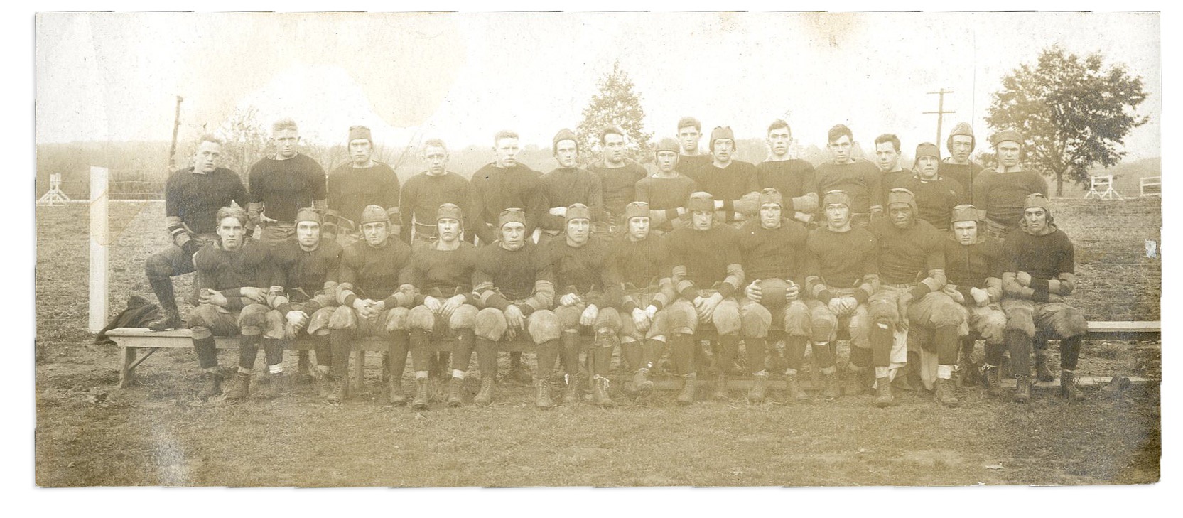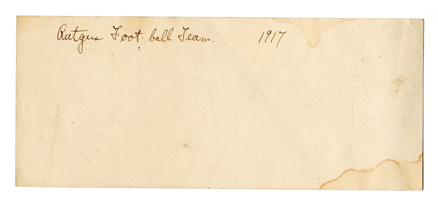 This is a small panorama photo of the Rutgers Scarlet Knights football team featuring a 19 year old Paul Robeson. It is amazing how Paul Robeson has become synonymous with Rutgers University diversity beyond African American studies. There is a Paul Robeson Cultural Center, Library and Galleries, to name a few, on the various campuses of Rutgers. In late 1915, a very brave Robeson became one of the first few African-American students ever enrolled at Rutgers. It is sad to say that when he tried out for the football team, his nose was broken and shoulder dislocated by teammates, a showing of the extreme racism of the time. Ultimately he was victorious; his play at end won him first-team All-American selection in both his junior and senior year, he was considered the greatest end ever and became valedictorian. This is a stunning 3.25x8" photo on the back in sepia fountain pen is "Rutgers Football Team 1917." We have only ever seen three or four photos of Robeson during his Rutgers football career.
