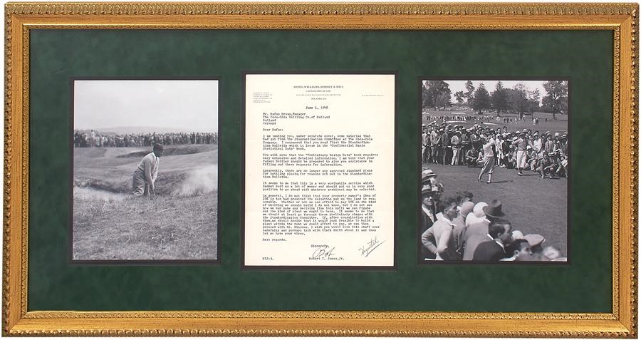 Legendary amateur golfer Bobby Jones made his living as an attorney, and he drafted the typed letter at the center of this handsomely framed display on law firm stationery, dated June 1, 1948. Next to his signature at the bottom appears to be the word "hospital" written in pencil, though that remains a mystery. The content of the letter concerns Coca-Cola bottling plants. Two black and white photos of Jones in action on the golf course flank the letter and the entire piece measures 34x18".