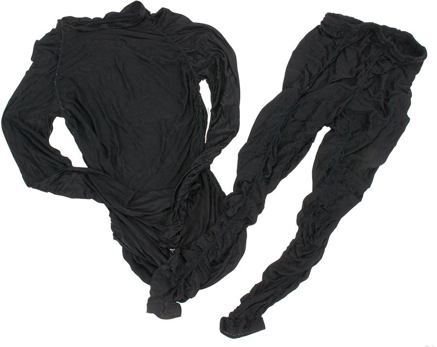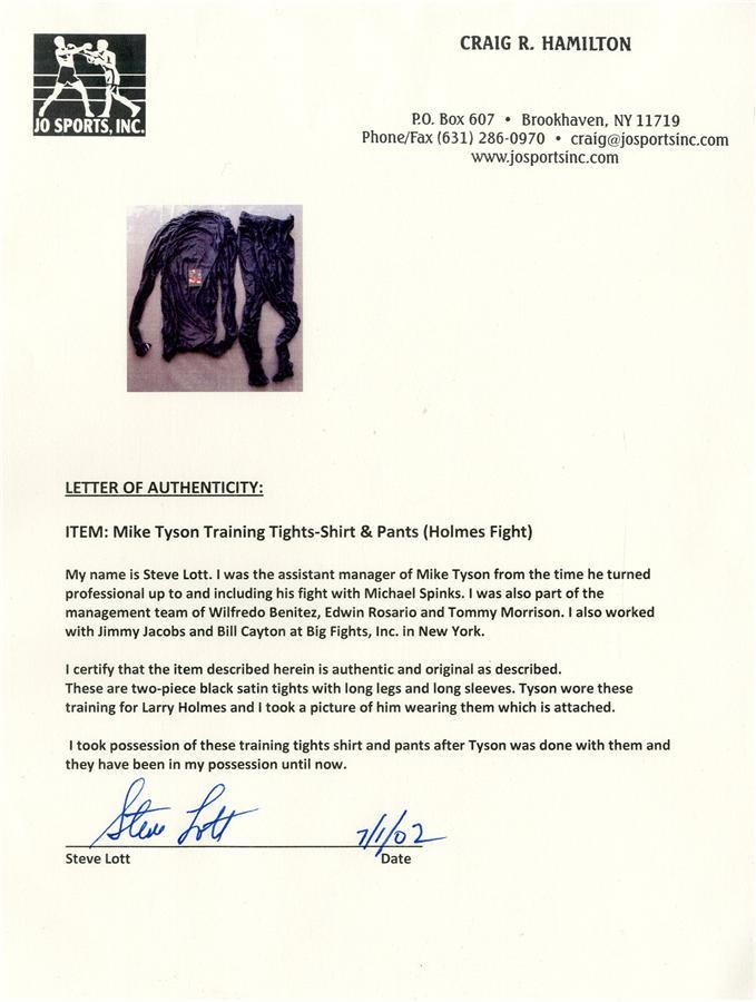 Mike Tyson defended his World Heavyweight Title against former champion Larry Holmes on January 22, 1988, in Atlantic City. The fight was competitive for three rounds, but in the fourth Tyson went to work, dropping Holmes and stopping him. Offered here is a set of training pants and shirt used by Tyson while training for this fight. Black in color and tagged Frank Shorter Sports Wear, Size L, these are similar to tights. They show wear, but are perfectly intact. Pants have a drawstring waist. Comes with a letter of authenticity from Tyson's assistant manager at the time, Steve Lott, who took possession of the outfit when Tyson was done with it. Also comes with a photo taken by Steve Lott showing Tyson wearing the outfit during training camp.