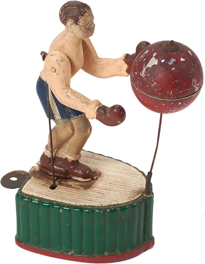 This hand-painted tin toy was modeled after Primo Carnera; it has the "slicked back" hair that was his trademark as a member of the boxing elite from this exciting and memorable period. He was so loved in all of Europe, but Italy was so proud that one of their own became the World Heavyweight Champion. This toy was constructed in Italy during that period as an ode to Primo. The toy is in perfect working condition and still has the original key, darkened with age, and displays great action; when you wind up the mechanism, Primo boxes the big red ball. It measures 7.5" high and has 99% of its original paint. Rare, as we have never seen this before.