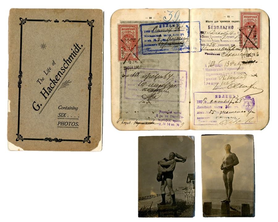 This lot includes a Russian passport from 1906 with multi-signatures including his formal Russian birth name, a promotional 1906 photo album, and two first-generation snapshots, all from the Hackenschmidt estate. These impressive relics were once the personal property of George Hackenschmidt (1877-1968). One of the first of the great wrestling champions, the "Russian Lion" was the FIRST free-style Heavyweight Wrestling Champion of the world. He was known for his impressive strength, fitness and flexibility and, later in life, wrote many books on physical culture. A stunning find, recently unearthed in the backwoods of New Jersey. First is his personal Russian passport he used to tour during the height of his wrestling career. The Estonia-born strongman used this passport for traveling inside Russia between 1906-09, based on multiple inner stamps. The 4x6" book features extensive writing in Russian from his own hand, including four full pages. There are three full signatures, plus what we believe to be a rare signature of his real Russian name, though this is not certain. The wrestler, who also fancied himself as a writer-philosopher, was the first freestyle Heavyweight Champion of the world. Then, a photo album with spectacular images of Hackenschmidt with bio at the end detailing his life, dates to 1906. It has some cover chips front and back. One we have not seen, it was also recently obtained from the Estate, and is eight pages complete. Also, two interesting first-generation snapshots are approximately 3x4"; bold, clear images, overall EX-VG, dating from the early 1900s.