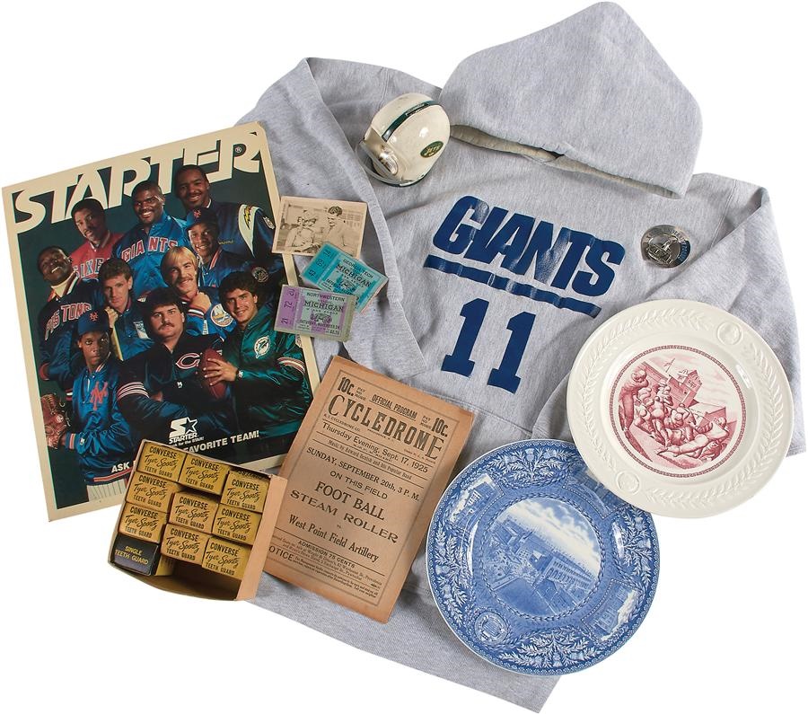 This is a diverse collection of football related items including: a primitive cycling program from 1925, advertising the first Providence Steam Roller NFL football game, it measures 7x10" and is GOOD to VG; Phil Simms Champion brand hooded New York Giants sweatshirt, size XL, worn by the two-time Pro Bowl quarterback during his playing days, drawstring removed; easel backed Starter advertising sign, comprised of board and measures 13.5x17" EX; 10 mouth-guards in the original black and yellow boxes were manufactured by Converse Rubber Co., the boxes are noticeably pre-zip code, and the lot includes the original case box. Most are EX, though one is missing the top flap; two attractive University of Pennsylvania football commemorative plates (10.5"), one is from 1929 and one is from the 1940 bicentennial - both are of magnificent quality made by Wedgewood of England. Both have a great pedigree with incised markings and stamps. One reads "Franklin Field" both NRMT; Super Bowl XLVII Xavier University chrome police badge almost 2.5" NRMT; Red Grange 1926 Amatler chocolate card, Spain 4.25x2.75" EX; two tickets Northwestern v. Michigan and George Tech v. Michigan from the late 1920s or early 1930s, measuring 2.25x5.25" VG-EX; N.Y. Jets figural ceramic bank (5" high) made in the 1970s, foil label reads "Wyatt Dunagan & Williams Inc., condition EX.