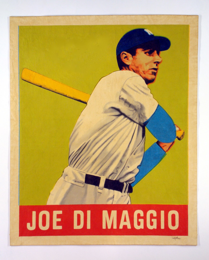 A swingin' superstar if ever there was one, Joe DiMaggio appears just as he did on the actual 1948 Leaf baseball card on this banner that serves as a large accurate reproduction. Measuring 40x33" and dated 2015, the banner is one of several that were created in mixed media on raw canvas, and were 'antiqued' on both the front and back. It is titled, dated and signed on the reverse.