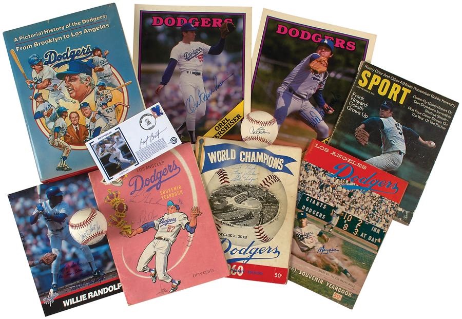 1) Maury Wills signed cover of 1963 yearbook showing him stealing #104. 2) 1954 Dodger team ball, ONL, some secretarial (GD). 3) OTers Game signed baseball NM (Garvey, Smith, Cey, Baker). 4) 1960 Dodgers yearbook signed on cover "To Hugh Best Wishes Gil Hodges." 5) 1968 SPORT Magazine "Shutout Streak" signed by Don Drysdale with him on cover. 6) Brett Butler signed cachet. 7-10) 1988 Topps folios signed by Fernando (2), Hershiser (2). 11) Willie Randolph SP. 12) 1975 OTers porgram signed by Pafko, Conlan, Frank Thomas, Labine, Craig, Amoros, Irvin, Hamner & Slaughter winning 1946 WS. 13) Press kit signed by Branca (lengthy inscription), Dick Schaap, Podres. 14) 1973 Dodgers team sheet with 18 sigs (Alston, early Garvey, Buckner, Downing, Gilliam, Osteen, Downing, Lasorda). 15) 1967 yearbook with 28 vintage sigs on their photos and cover (Alston, Ozark, Davis, Sutton, Michael, etc.). 16) 1984 Pictorial History of the Dodgers hardcover signed in person by 15 (Erskine, Labine, Branca, Davis, Snider, Buckner, huge Lasorda, Roe, Furillo, Podres, Drysdale, etc.). 17) Erskine single signed ONL, NM. 18) Happy Felton 8x10" vintage signed photo.