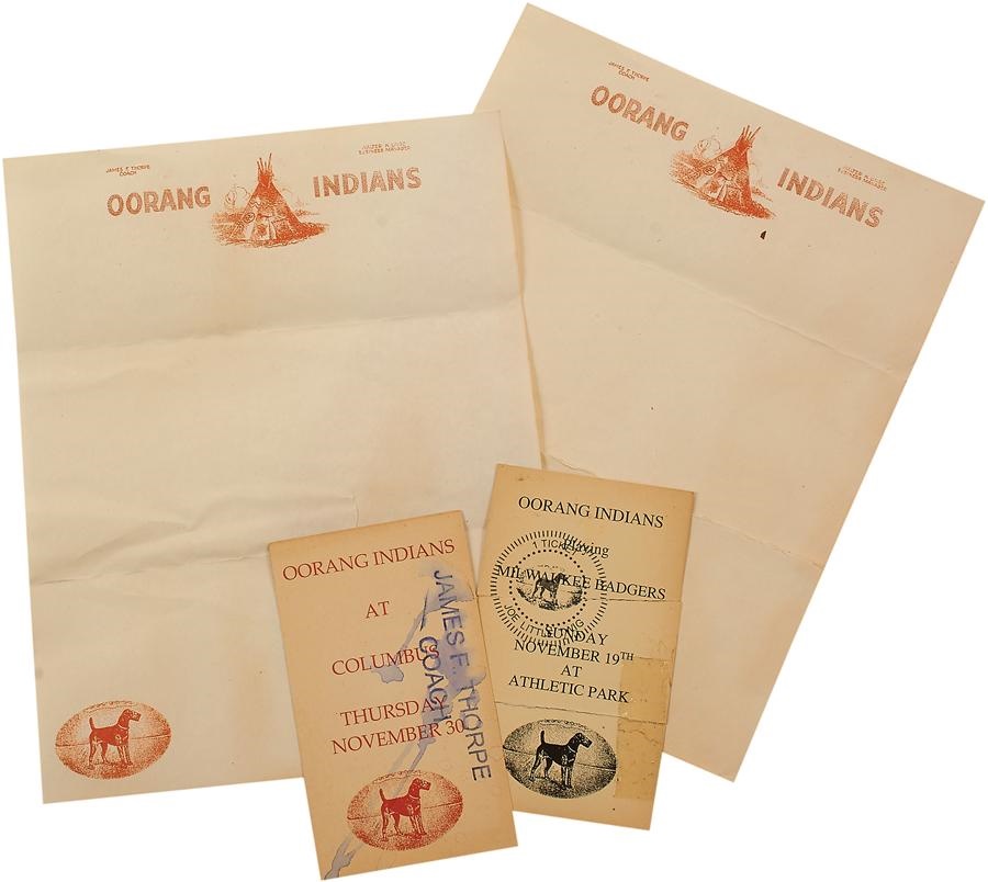 They were a traveling team comprised solely of American Indians, and they played in the NFL from 1922 to 1923. The Oorang Indians of LaRue, Ohio featured a player-coach by the name of Jim Thorpe, who was in his mid-30s at the time and near the end of his storied playing career. This lot includes 1922 tickets from the Indians with "James F. Thorpe coach" printed on one, and "Joe Little Twig" on the other. There are also two Oorang Indians stationery letterheads with "James F. Thorpe Coach" printed on the top left. Fascinating artifacts from one of the premier athletes of the 20th Century.