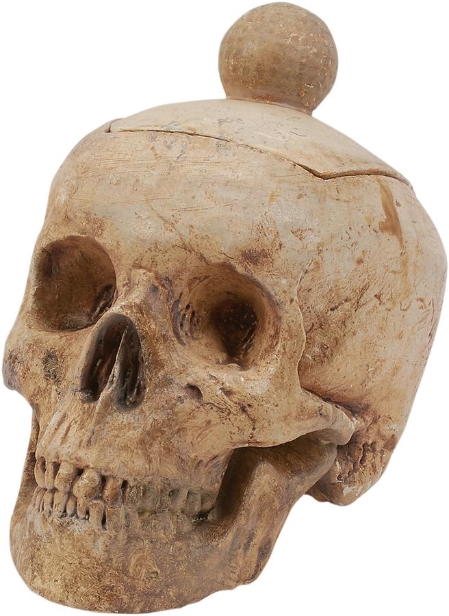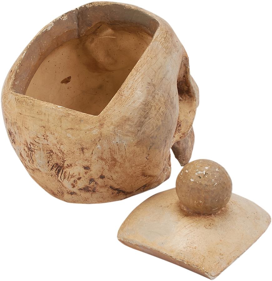 A unique figural two-piece skull from the 1920s, composed of chalk, this sat on a counter-top in a sporting goods store as a promotion for Draper and Maynard "Skull" model of golf balls, which had a skull and cross bones logo. There was a preoccupation during the late Victorian era through the 1920s, with gravedigging and morbid items, including skulls and crossbones. This piece is a manifestation of this preoccupation and was made to get the buyer's attention. The figural golf ball, which serves as the handle, is marked D&M. The bottom has an incised maker's mark but we are unable to make it out. It measures 7.75" long and stands 6.75" tall, and condition is excellent. This piece is exceedingly rare as we have never seen it before.