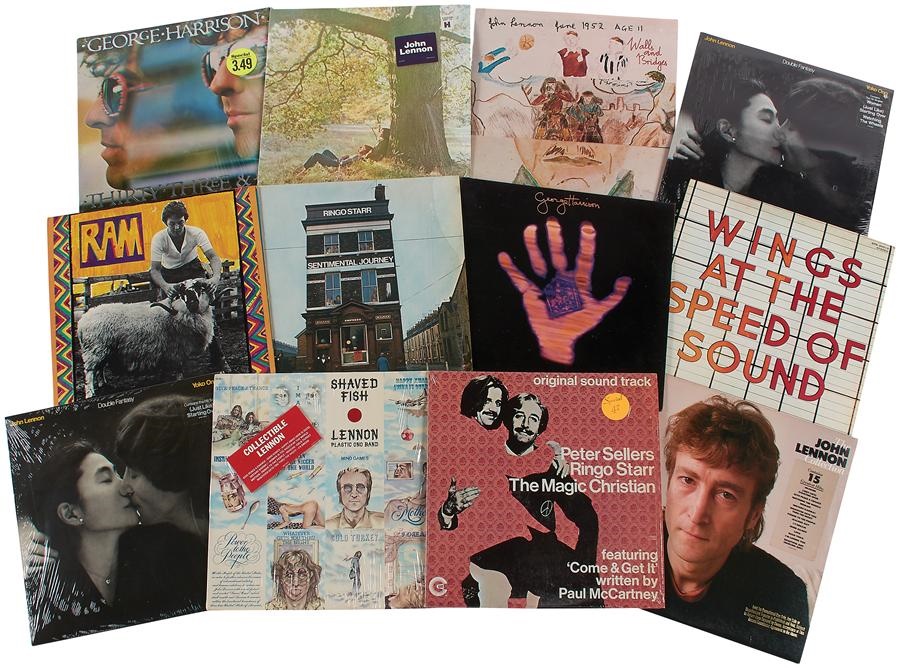 This collectors grade lot is from one devoted collector. All are original release and NM or better unless noted. JOHN: John Lennon Collection promo Quiex II limited edition, two Double Fantasy in shrink - one with cutout hole and sticker, Shaved Fish in shrink with sticker, Walls & Bridges Plastic Ono in shrink with sticker. RINGO: Magic Christian Soundtrack in shrink with sticker, Sentimental Journey with shrink. PAUL: Ram with Apple label, At the Speed of Sound (Japanese with sash). GEORGE: 33 1/3 in shrink with sticker, Living in the Material World. Eleven total.