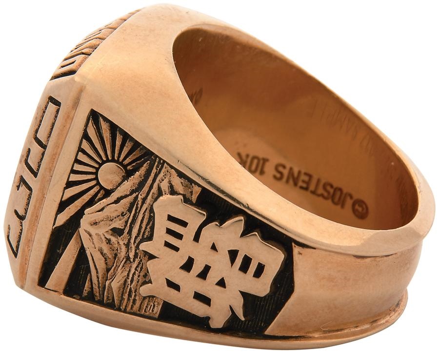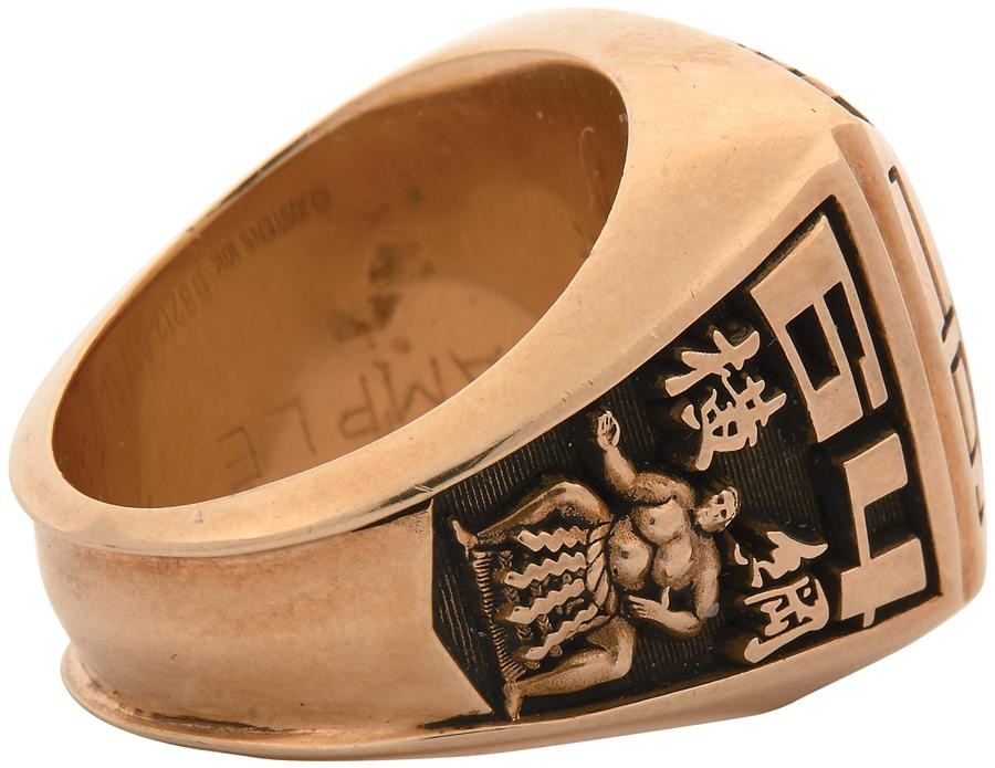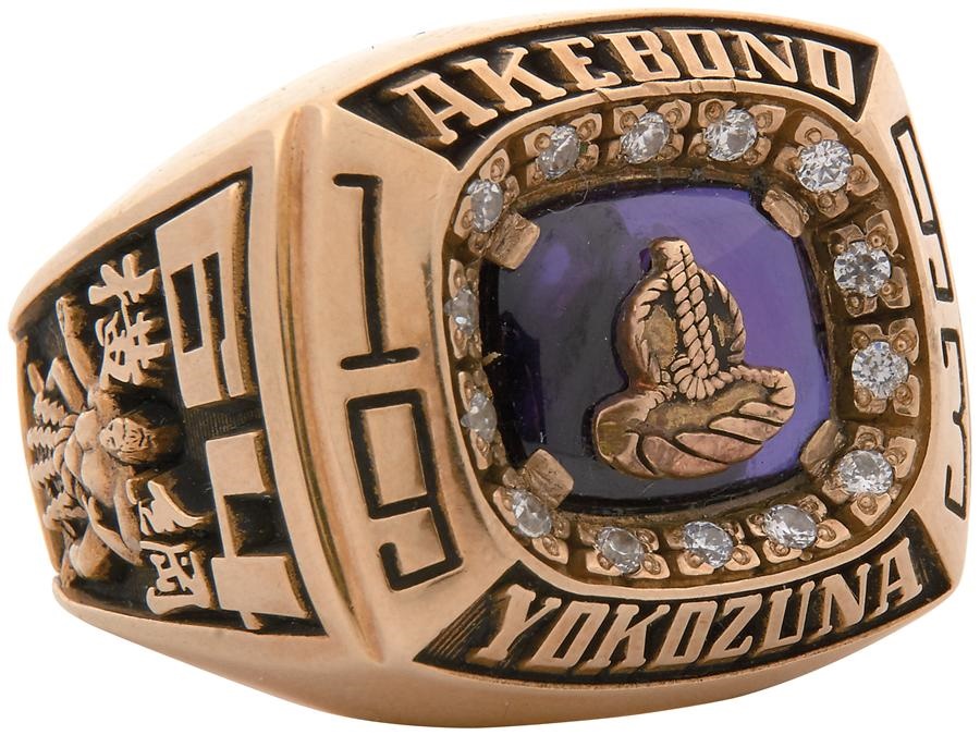 This magnificent gold championship ring is nearly identical to the one presented to Akebono in 1993 for becoming the Yokozuna, or grand champion, of sumo wresting in Japan. He has the distinction of becoming sumo's first foreign-born grand champion, the 64th overall, in the shortest time since entering the ring. He was born in Hawaii and quickly rose through the ranks in an illustrious 13-year career, fighting with devastating pushes that took advantage of his 6'7", 514-lb frame with 11 career championships. The ring has a "64" and a raised image of a sump wrestler on one side, and Japanese imagery and lettering on the other. Around the perimeter is "Akebono" and Yokozuna." The total weight of the gold is 36 grams. Inside is incised "Jostens 10K B8212-037 Sample." This is truly an impressive and beautiful ring in NRMT condition, an authentic salesman's sample, not a replica.