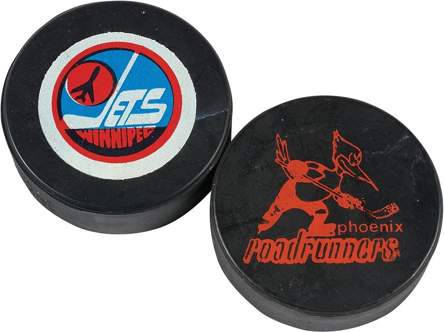 First offered is a WHA hockey puck issued from 1975 thru 1978 for the original Winnipeg Jets, one of the teams eventually part of the merger with the NHL. Puck is NRMT. The lot also includes a vintage Phoenix Roadrunners in EX-MT condition.