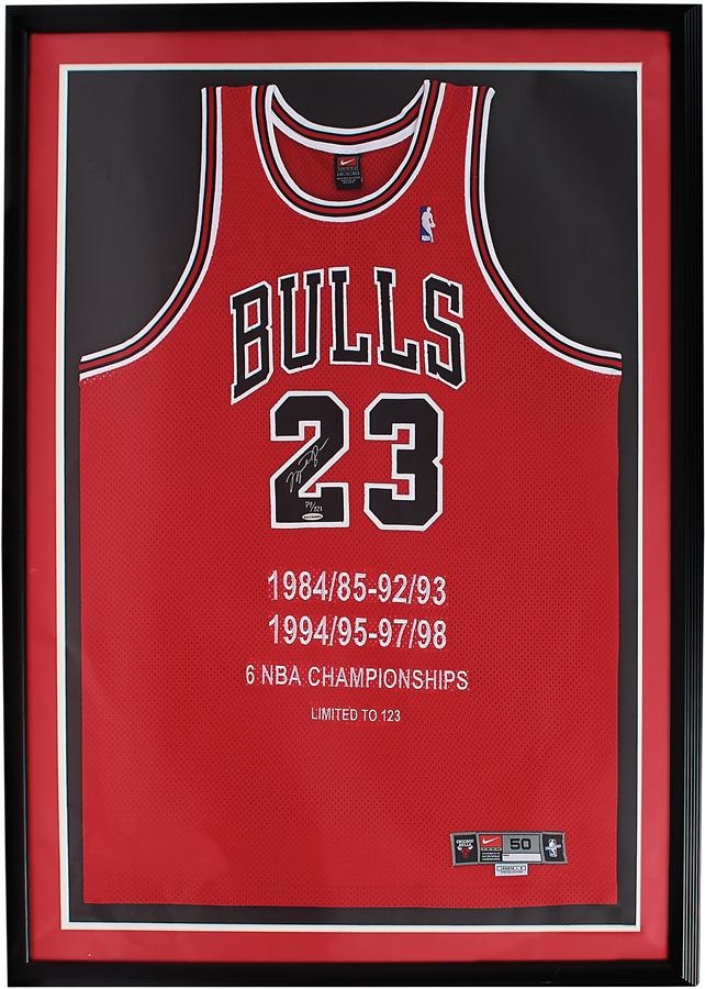 Arguably the greatest player in basketball history, Michael Jordan signed this sensational pro-cut Nike jersey that is framed and numbered 79/123. Embroidered in white is "1984/85-92/93, 1994/95-97/98, 6 NBA Championships, Limited To 123." Michael's signature is in 8/10 silver Sharpie on the "2" in his number. Includes Upper Deck authenticated hologram and certificate, as well as a PSA LOA. The jersey is in NRMT condition and it the entire framed piece measures 35.5x48".