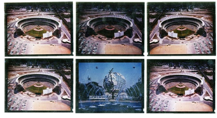 An amazing collection of 4x5" full-color "from the camera" transparencies, each envelope is stamped "Jack Downey -Dir. of Photography New York World's Fair." These images are original, similar to negatives as they can be blown up to any size. Also includes the Mets' former home - Shea Stadium - which debuted the same year as the 1964 World's Fair - which is depicted in five shots. There are multiple aspects of the Fair and multiple terrific shots of the Unisphere and monorail, as well. Several duplicates are included. The quality of the photography is phenomenal. Condition is EX-MT.